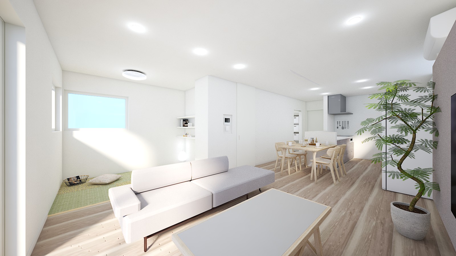 18帖のゆとりあるLDKには、ほっと心が和らぐ畳スペースを隣接。家族が自然と集まる、くつろぎの中心です。