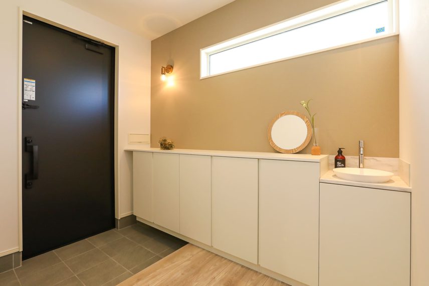 清潔感のあるシンプルな形にまとめたコンパクトな手洗い場。玄関近くの限られたスペースでもスッキリ。