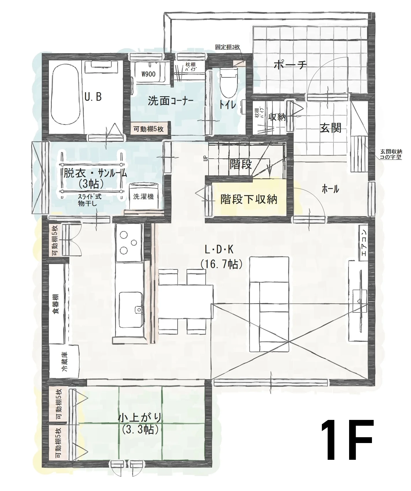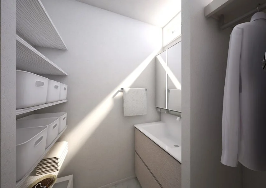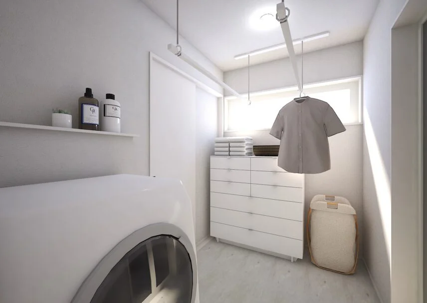 ・サンルームには室内を広く使えるようスライド式の物干しを設置。毎日のお洗濯や洗濯物が多い日も安心!