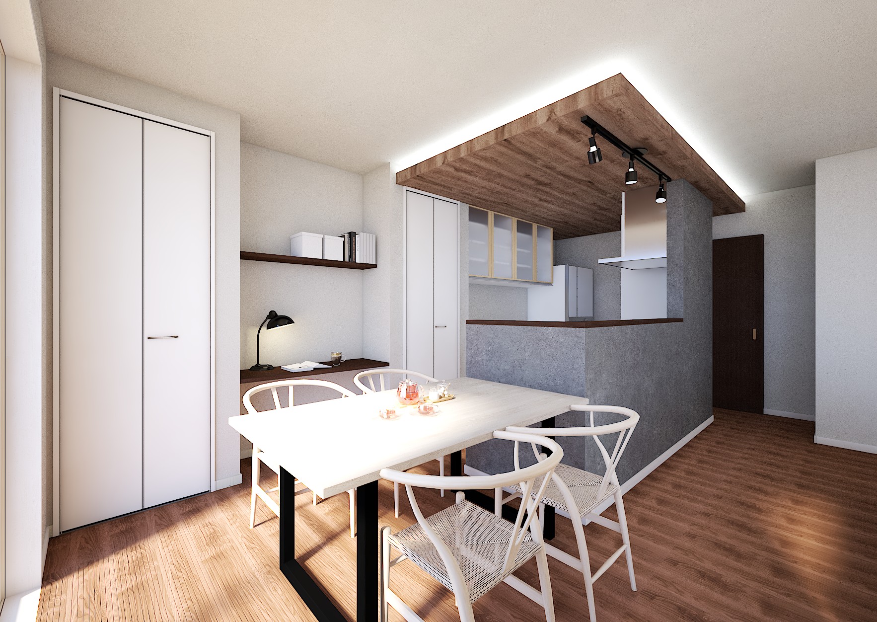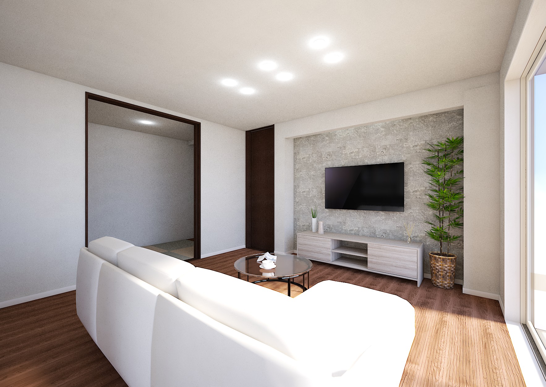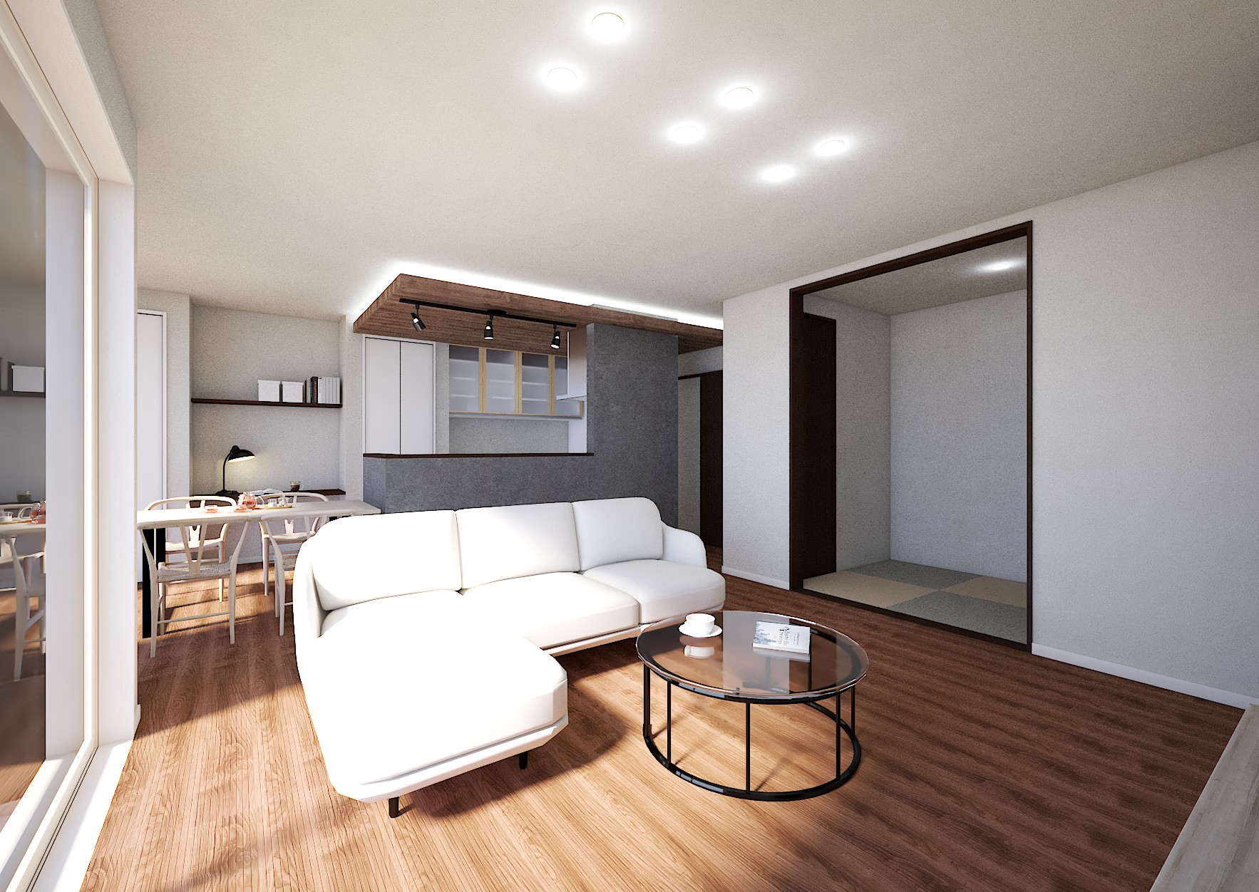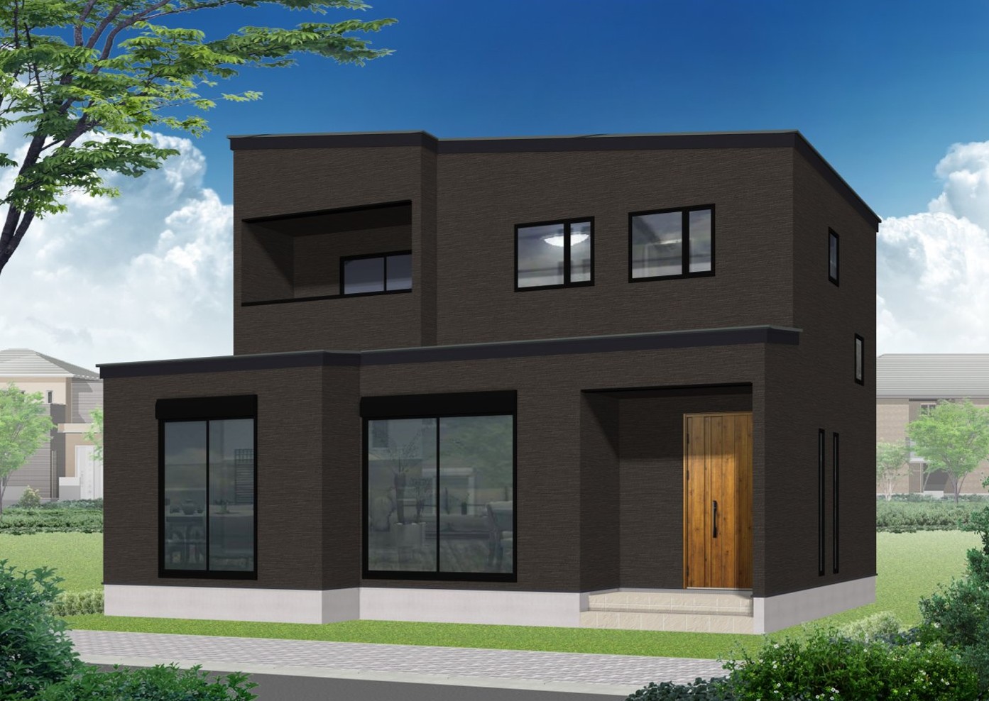 ブラック+スクエアフォルムの外観とダークな印象でまとめた室内が統一感のあるモダンな雰囲気を醸し出し、キッチンの下がり天井+間接照明やTVのアクセントウォールがカッコよさを引き立ててくれる。