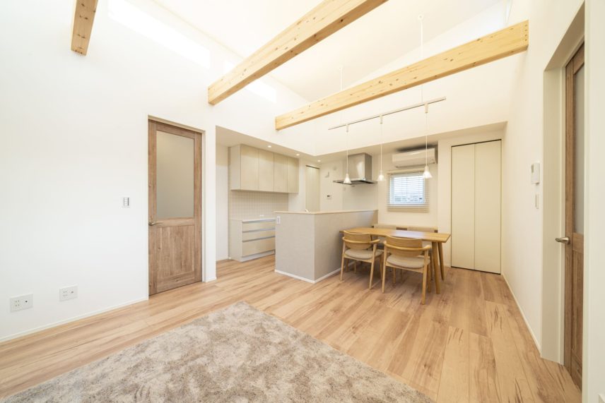 ■ LDK約16帖!リビング上部には素材感を生かした無塗装の木目がオシャレな現し梁を設置。