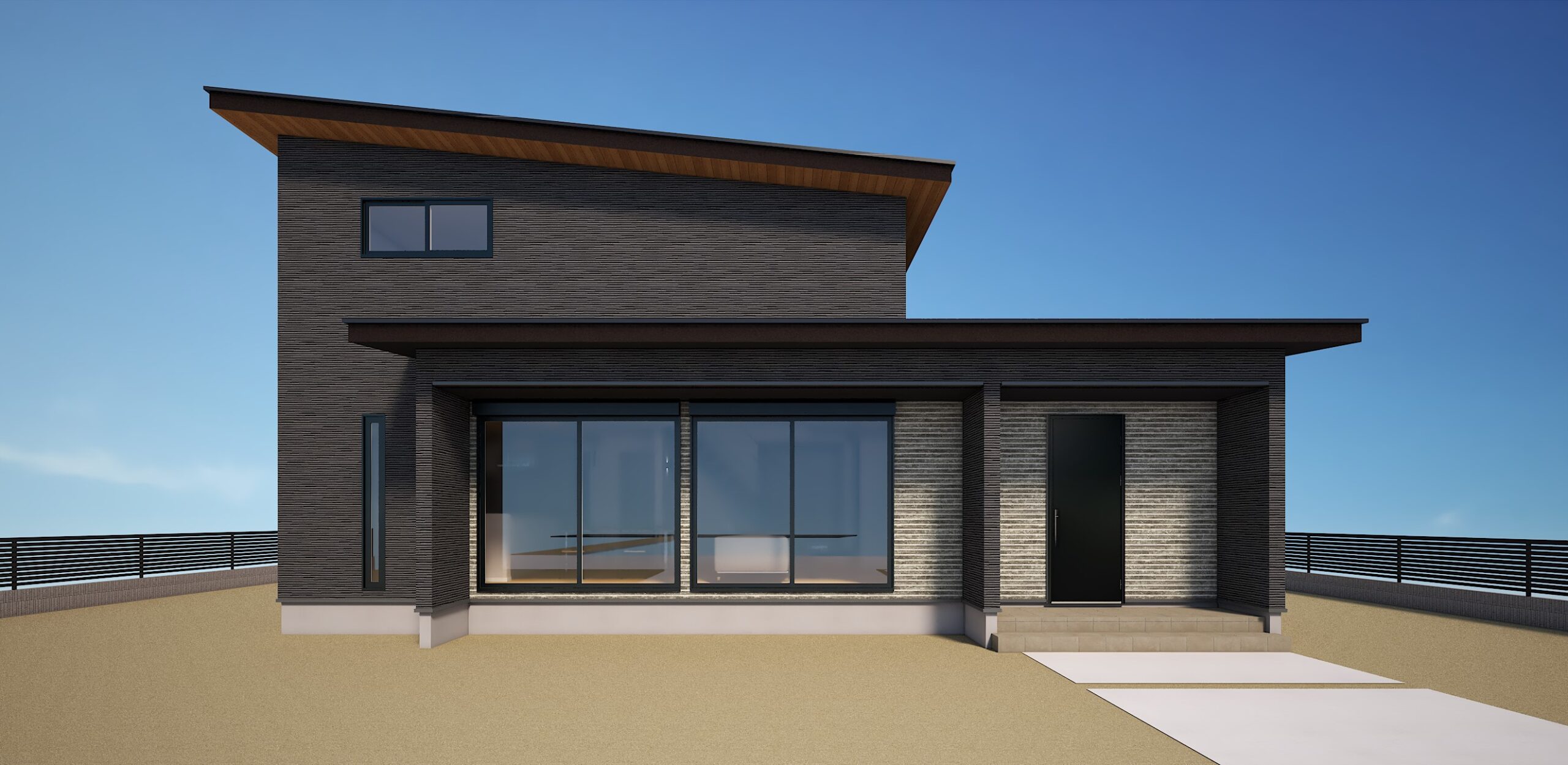 ✓片流れ屋根と下屋の水平ラインが和モダンの雰囲気を醸し出す外観