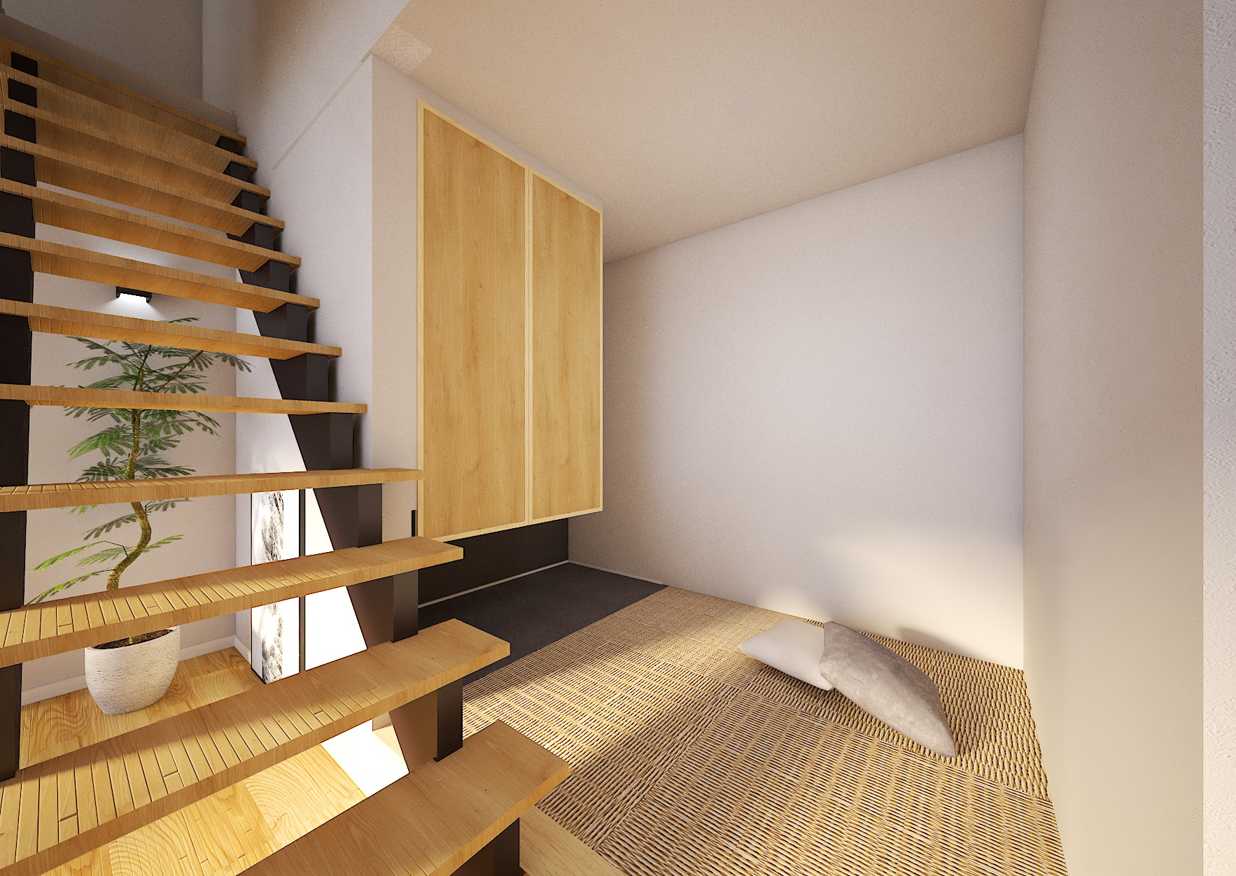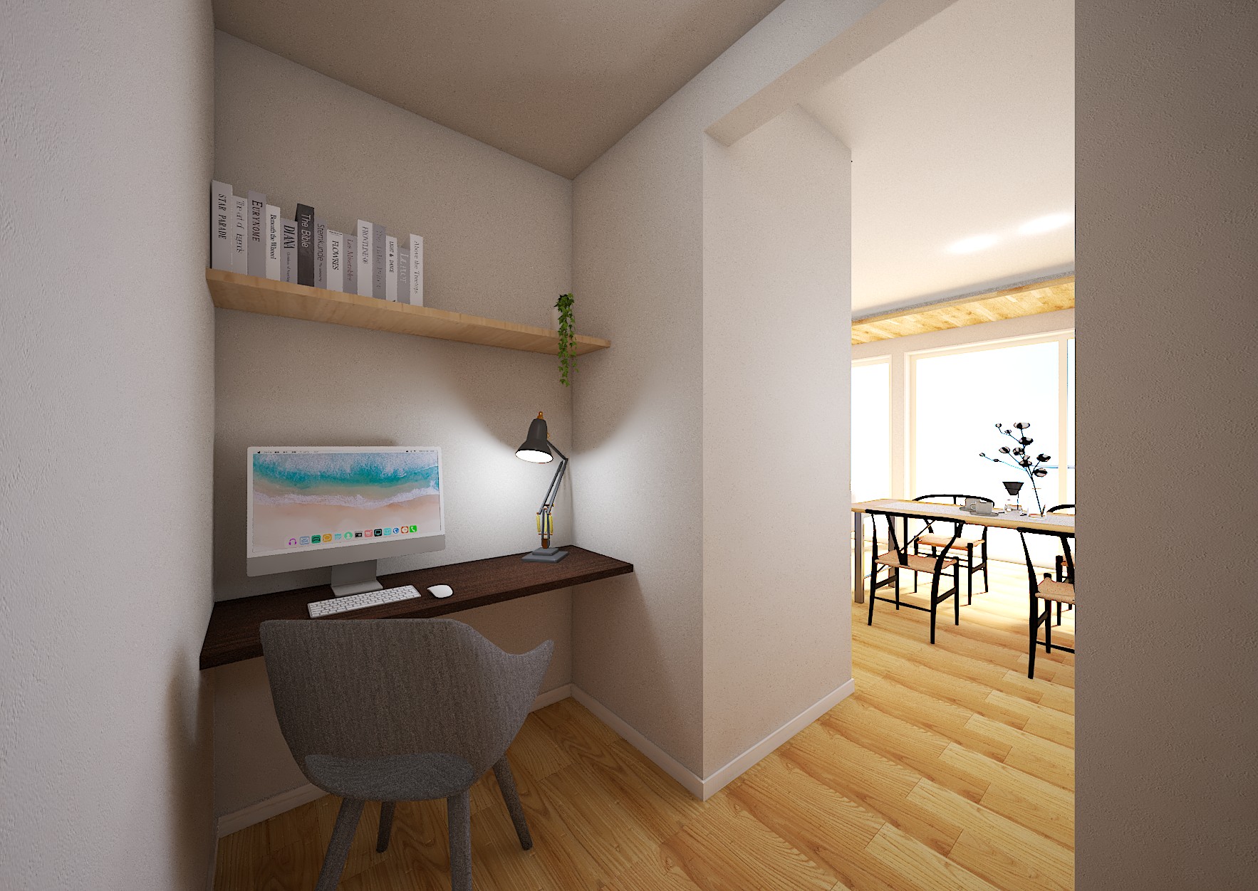 オープン階段越しに隣接した籠り感のある2帖の小上がり和室と視線的に隠れた位置にある1.8帖の書斎
