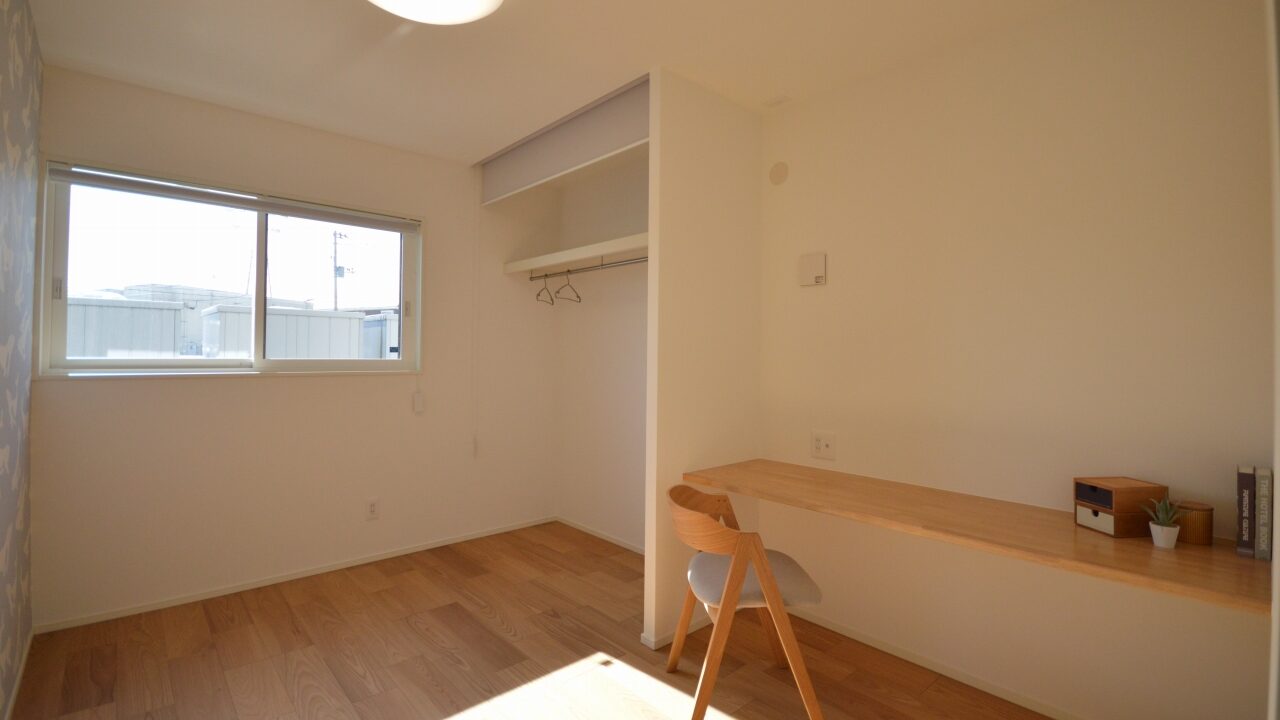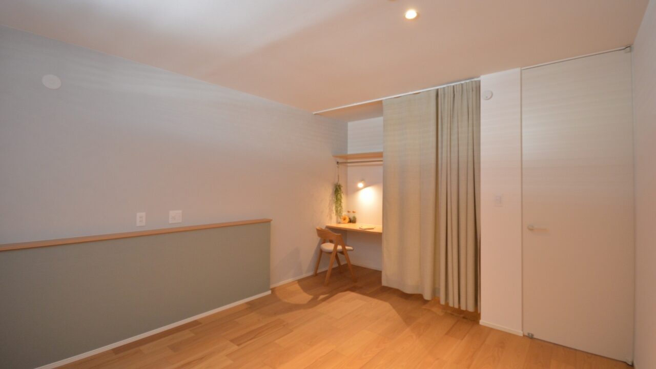 収納はカーテンで仕切れる形とし、一部をデスクスペースとすることでリモートワークにも対応。