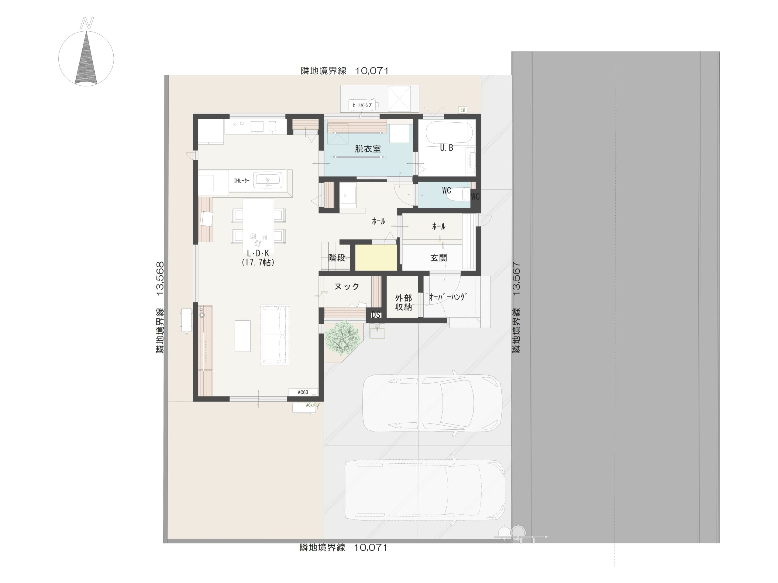 敷地面積41坪とコンパクトながら、お庭と駐車スペースを確保した配置。