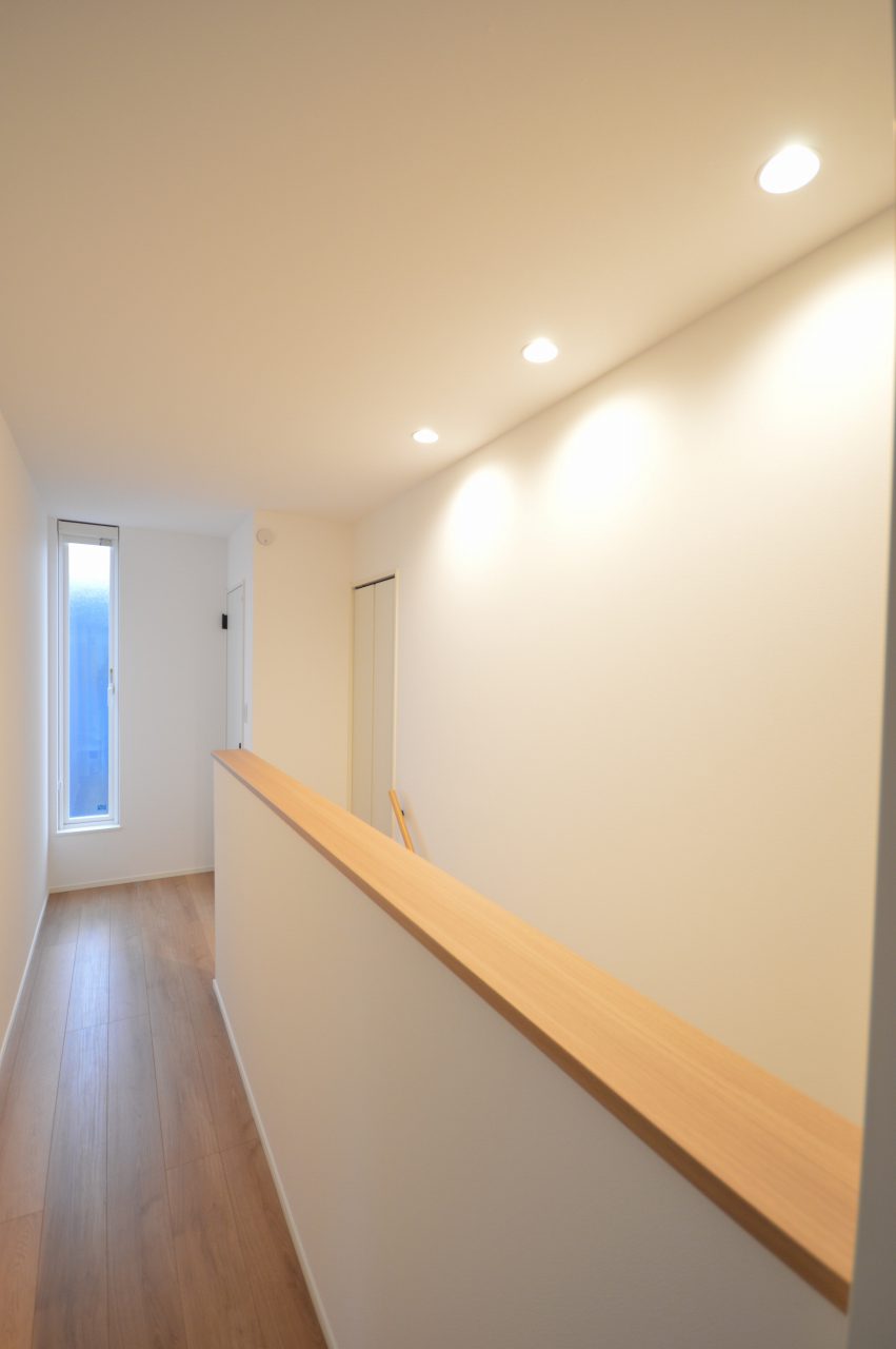 照明の配置が壁を照らし、階段の照明と兼用する2階ホール。