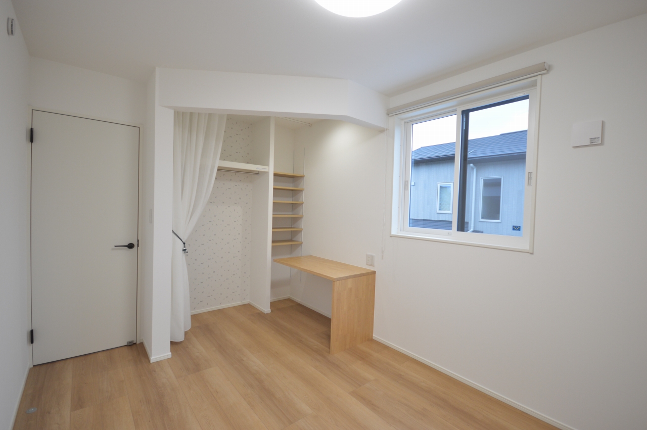 カーテンで隠せる収納とスタディーデスクが一体となったデザインの子供室。