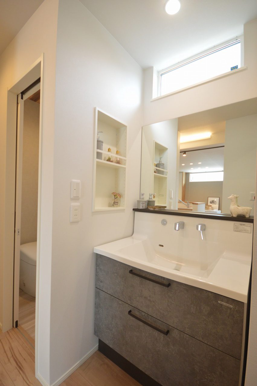 設備メーカー製の機能的なシンクに、単板ミラーを用いて造作風に。壁面ニッチでいつも使う物も収納。