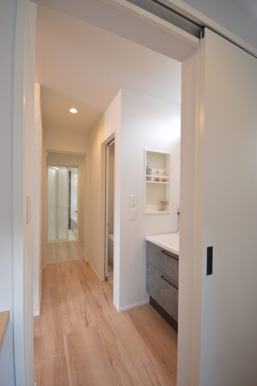 サンルーム→洗面→トイレ→脱衣室→浴室と一直線に水回りが繋がります。