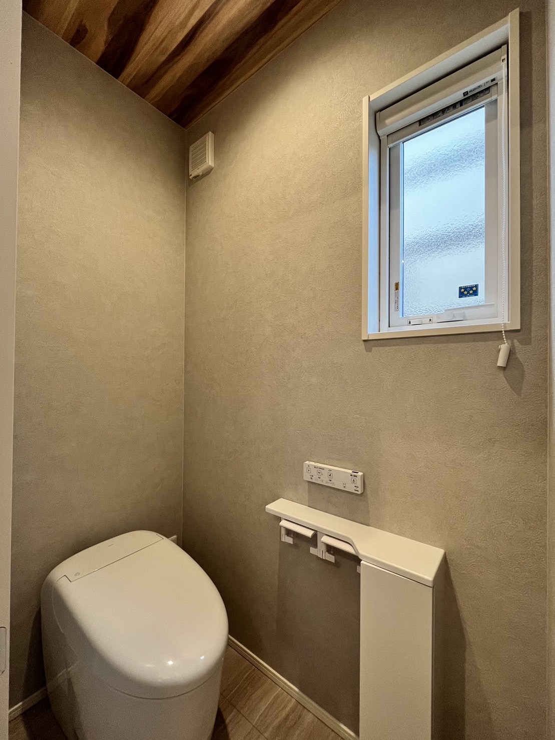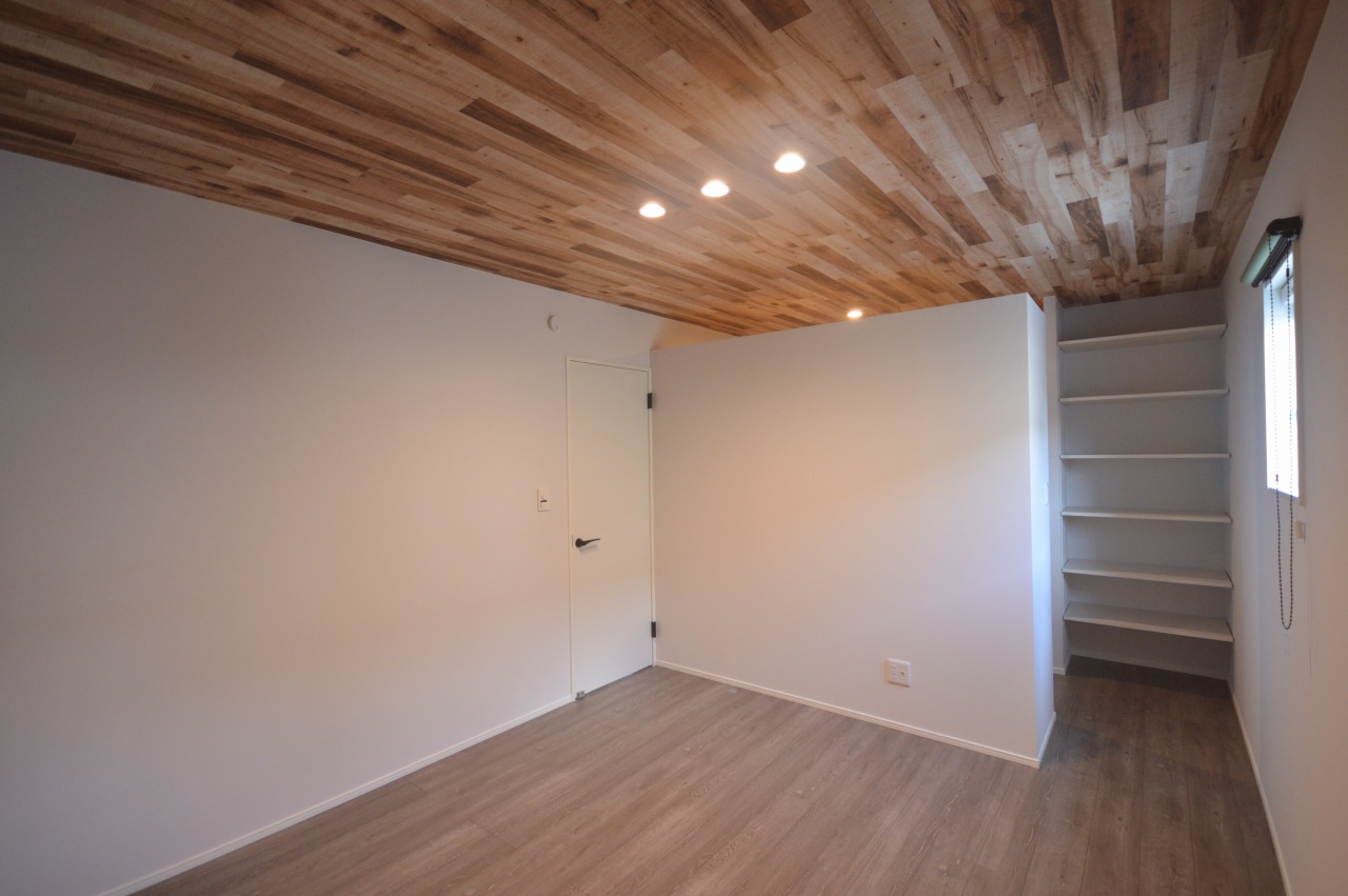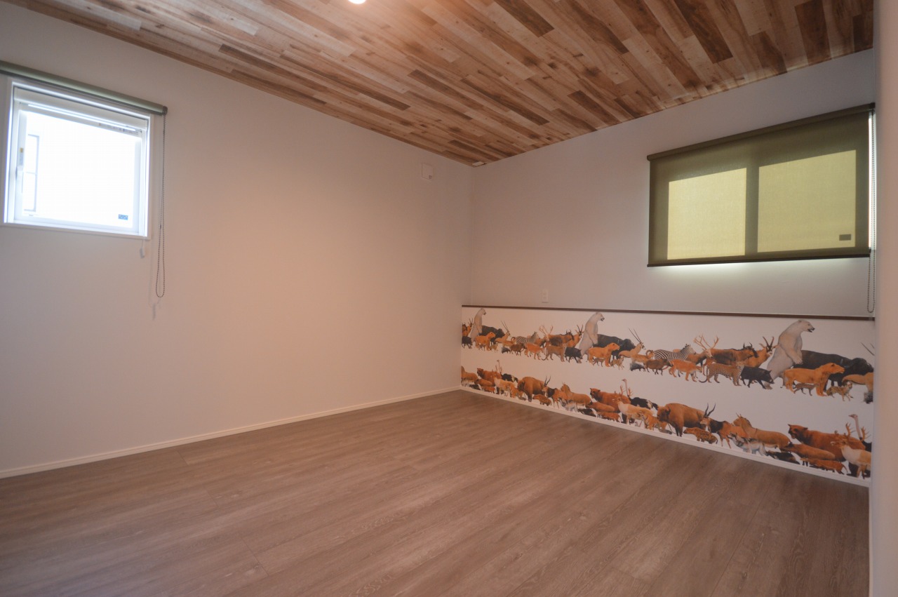 木目の天井と腰壁の動物が行進するクロスで、プライベート空間を個性的に。