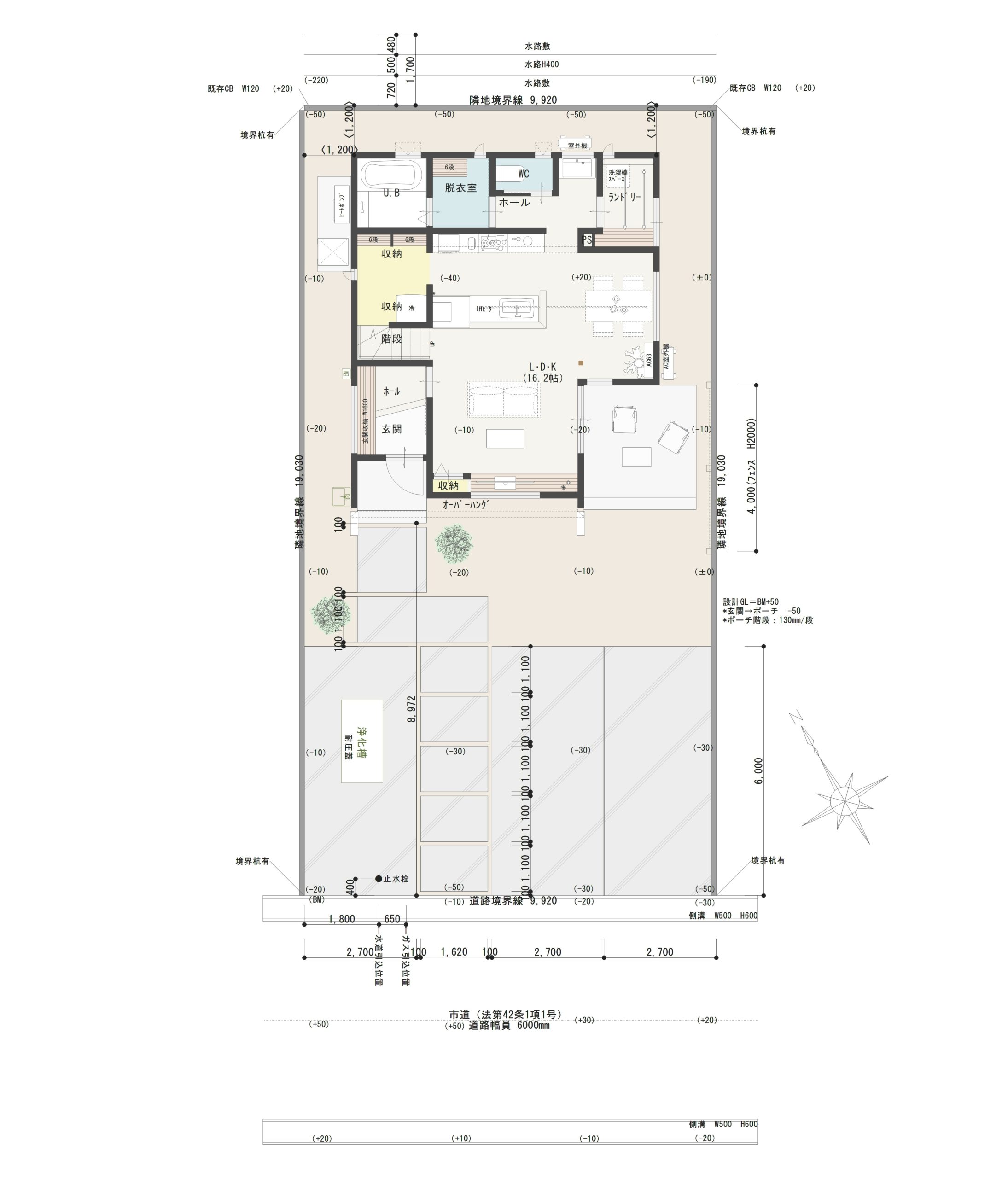 一直線の水回りとL字型のLDKで光を取り込む間取り。