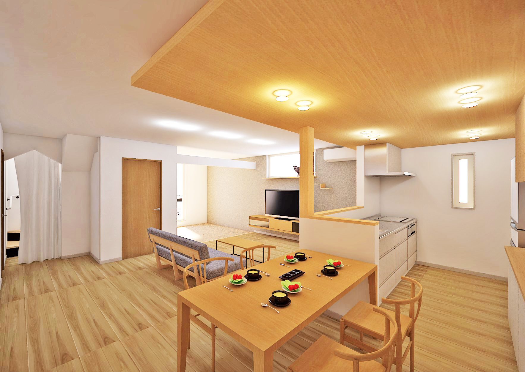 ダイニングキッチン上は下がり天井とし、間接照明で空間を柔らかく照らします。