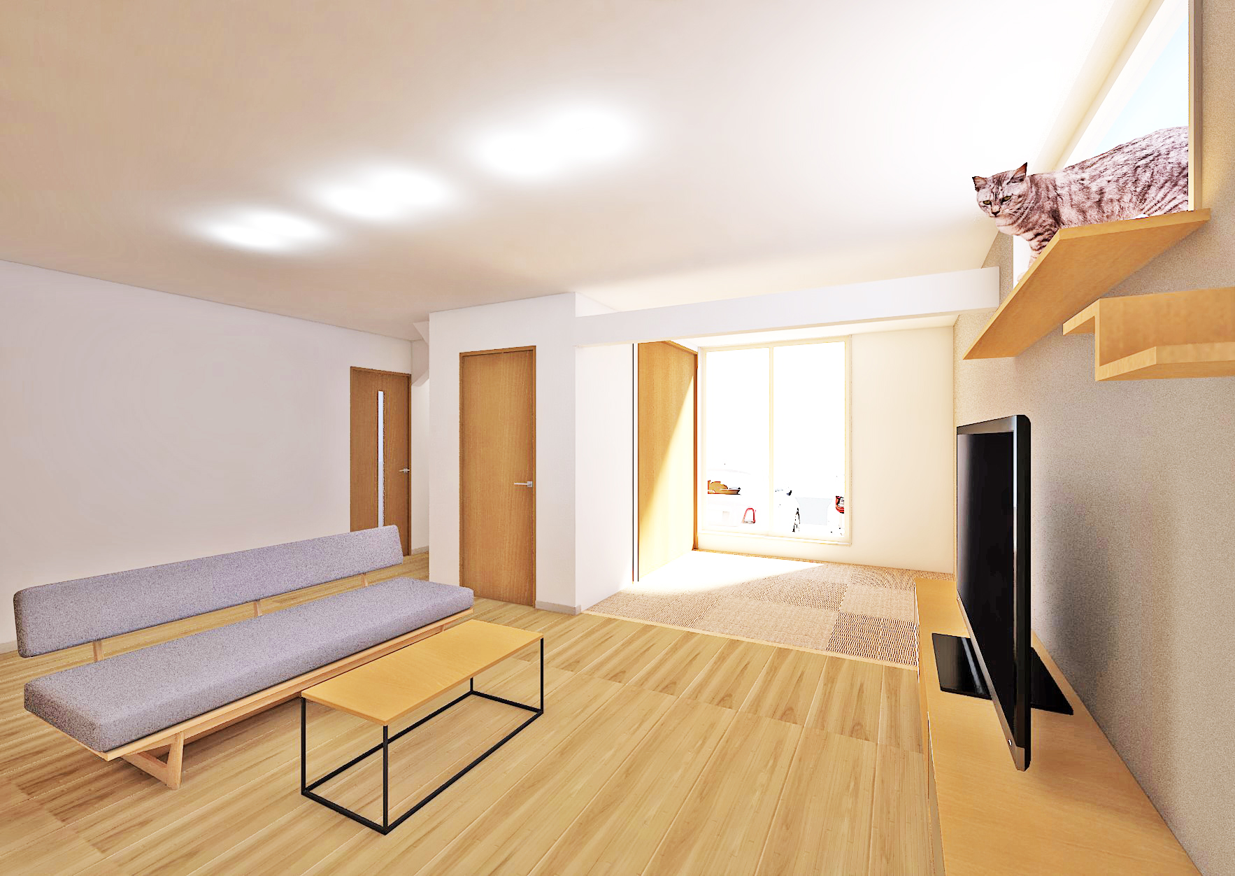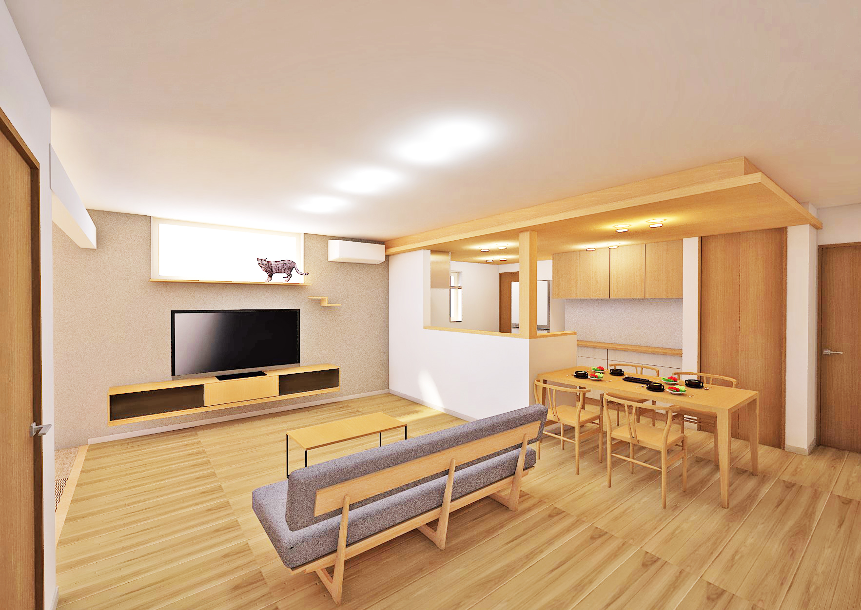 リビングにはキャットステップと、梁を低い位置に設置し、梁の上をネコが歩けるように。