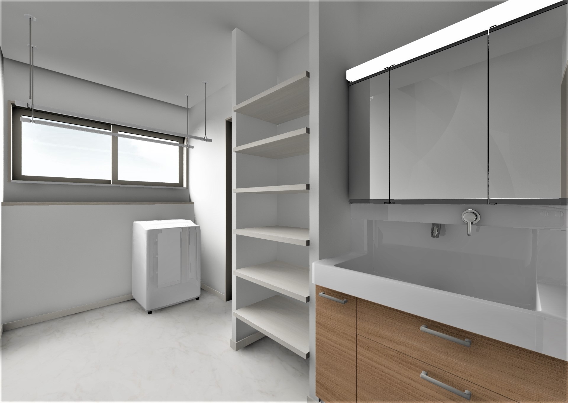 干してすぐ仕舞える収納のあるランドリー。
