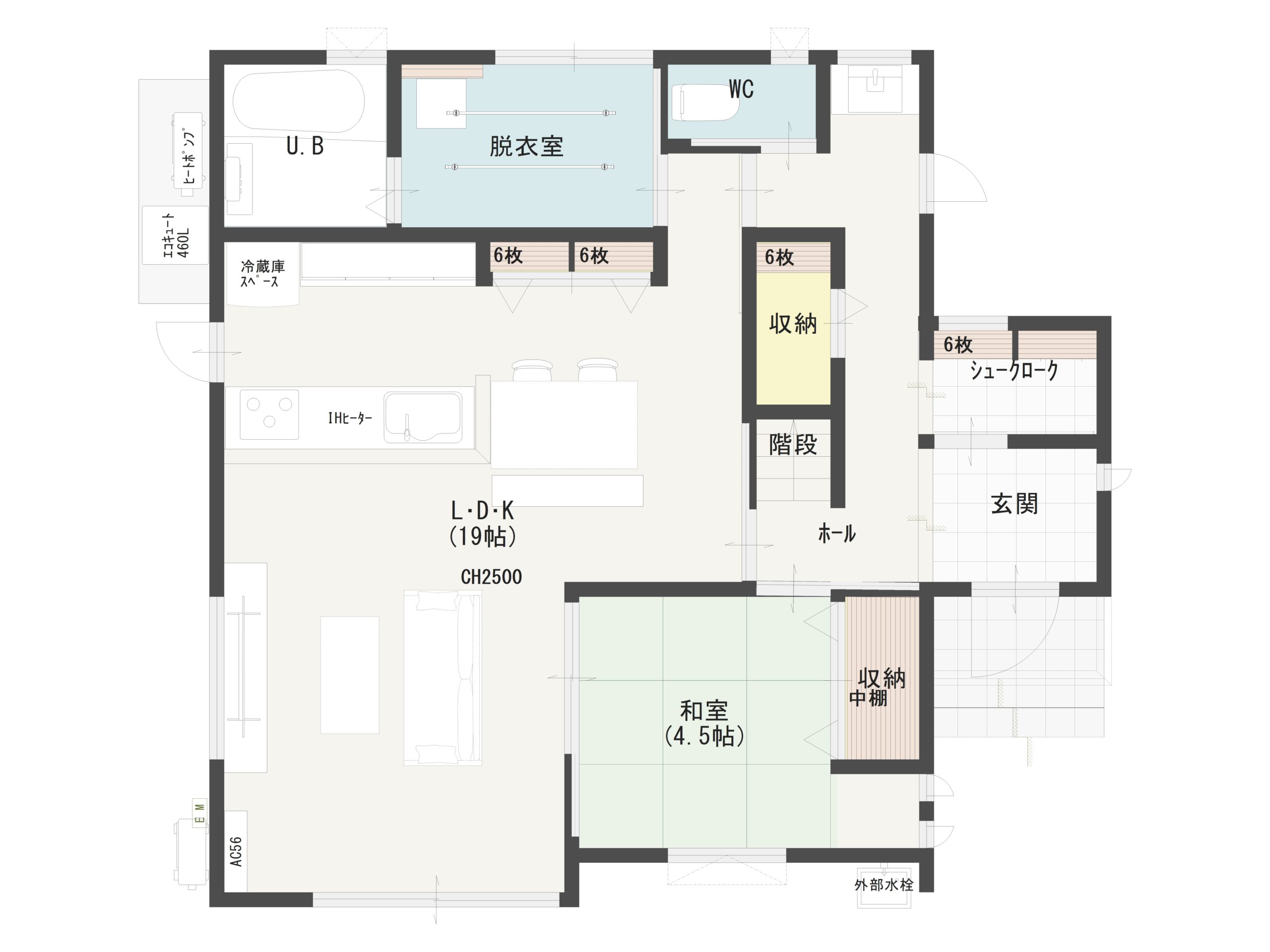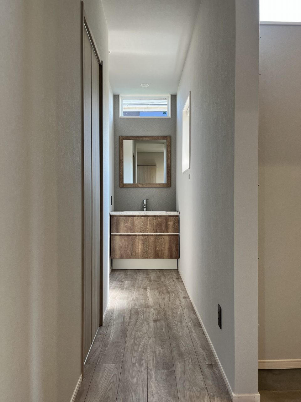 玄関→洗面・トイレ水回り→LDK→玄関と、回遊できる間取り。