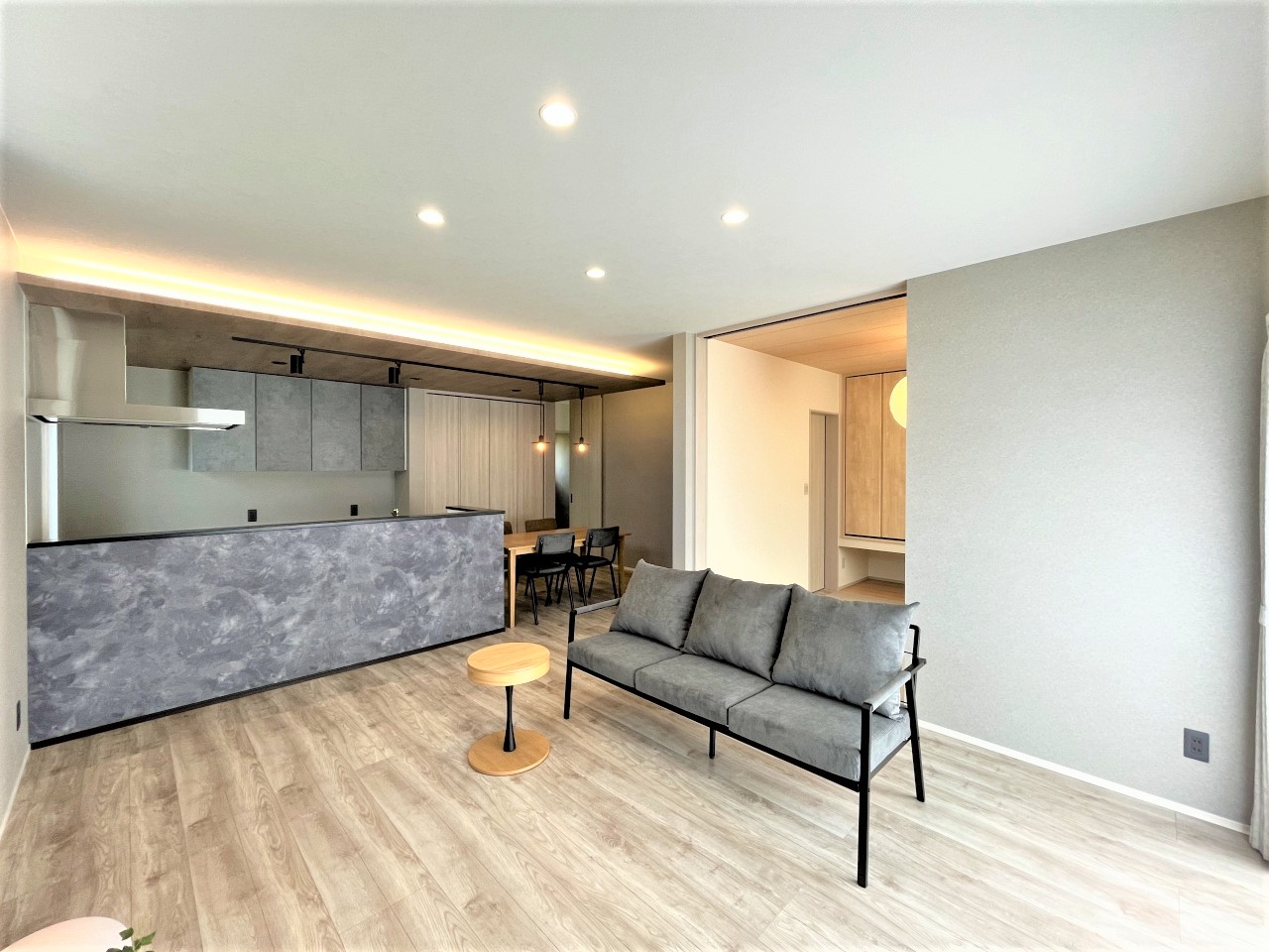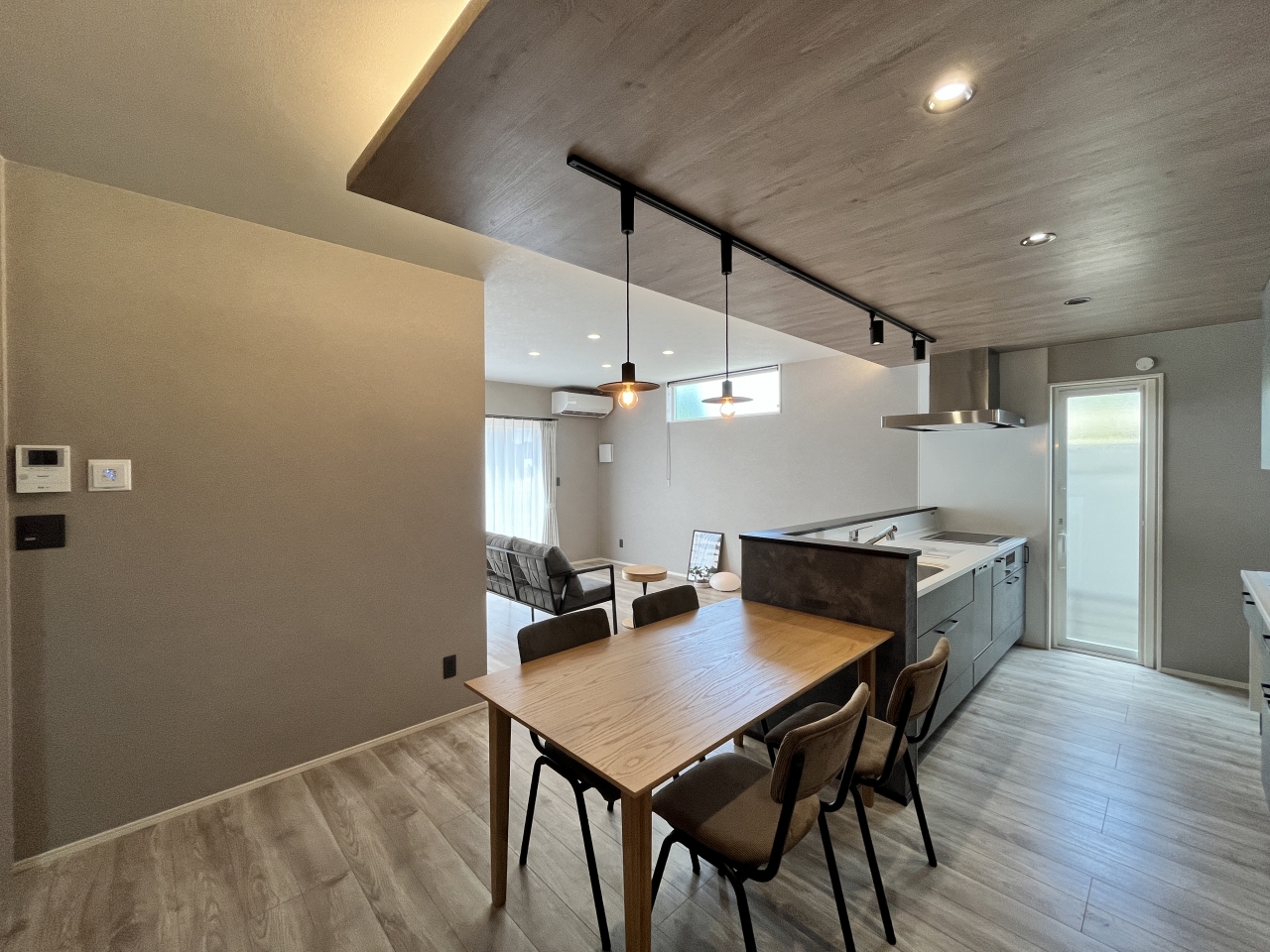 ダイニングキッチンの下がり天井や間接照明がアクセントになるLDK。