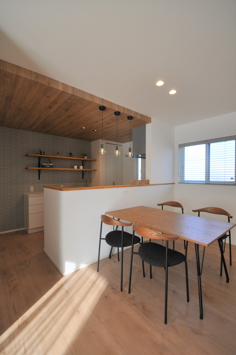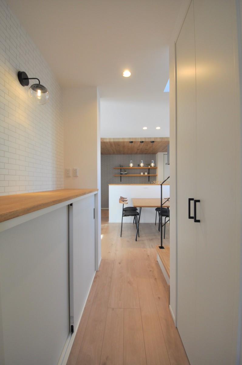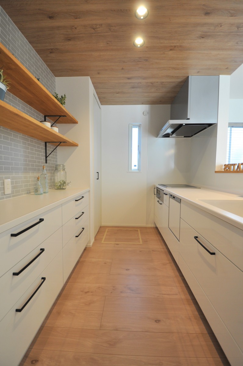 ホワイトを基調とし、ブラウンの木目がアクセントのナチュラルテイストな外観。陽当たりがよく南側に十分な庭スペースを確保しました。