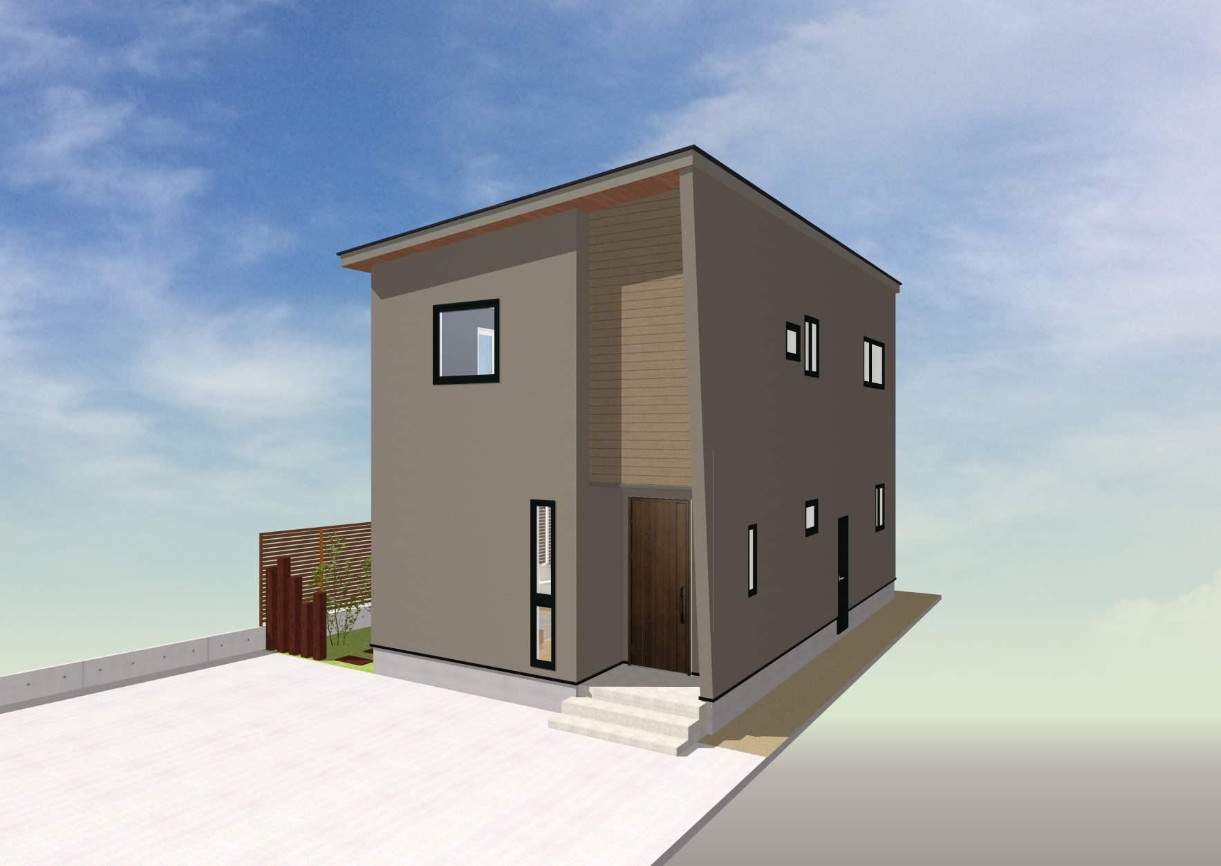 吹付を使ったスタイリッシュな外観の住まいが完成しました。角地で、周りの視線が気になる道路側にフェンスを設置しプライバシーを確保。そのためタイルテラスでプライベートな時間を過ごせます。