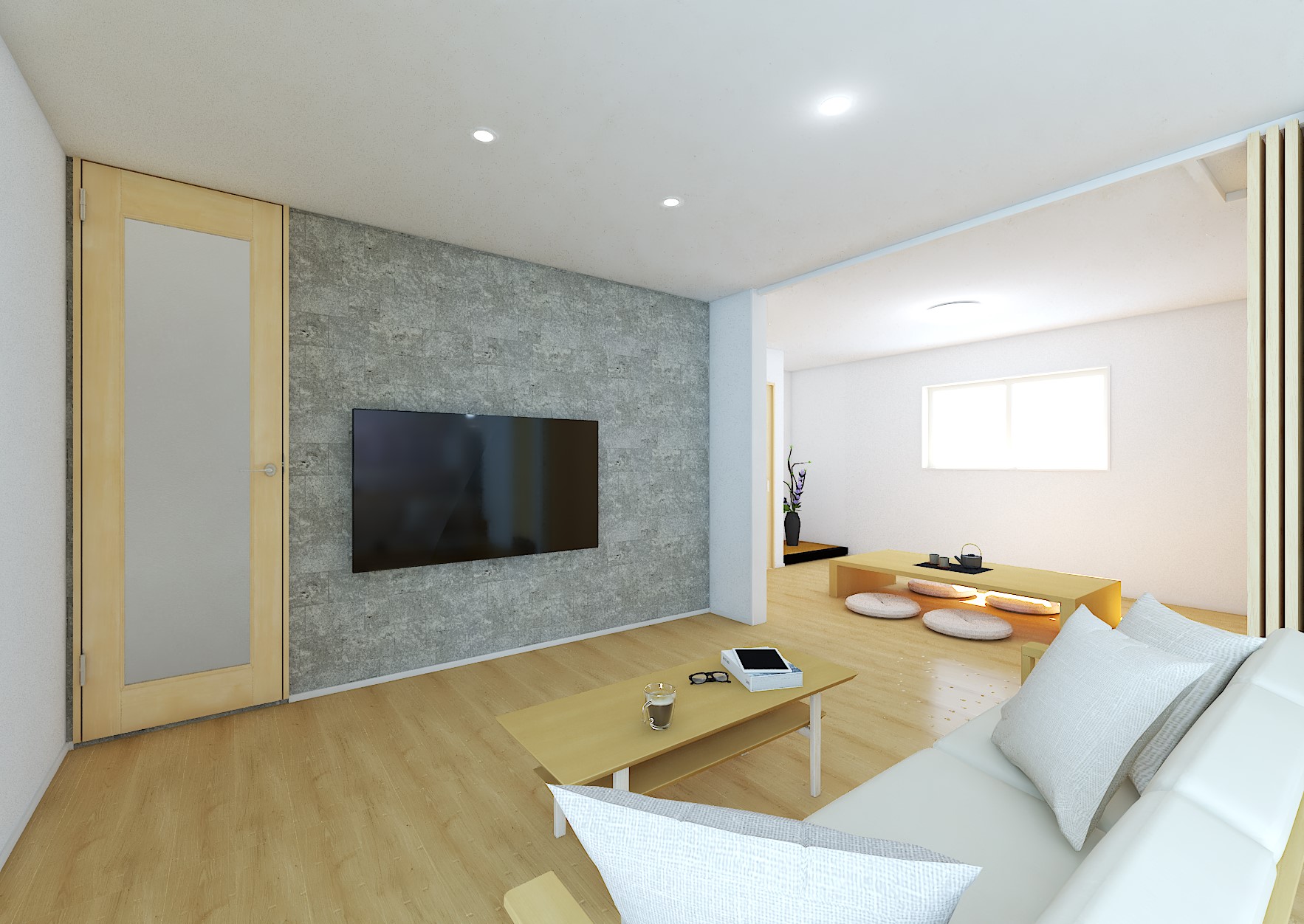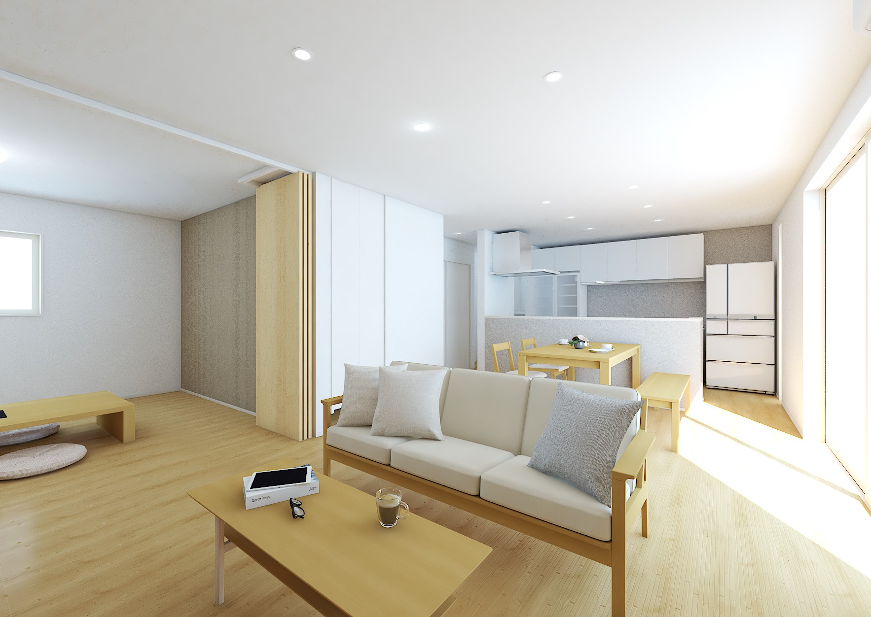 LDKと隣接している7.8帖の洋室と21.3帖のLDK、合わせて29.1帖の大空間を実現!木目調の床や家具が温かみを感じさせ、白を基調とした内装がさらに広々とした印象を与えます。
