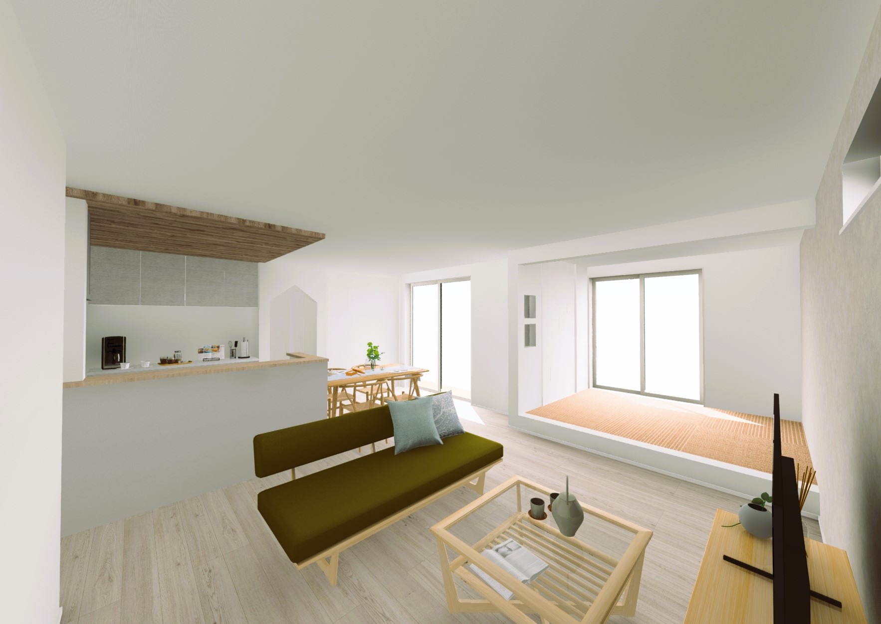 LDK横にはオープン小上がりの畳スペース、ソファーに座りきれなくても小上がりに腰掛け家族全員で団らん◎