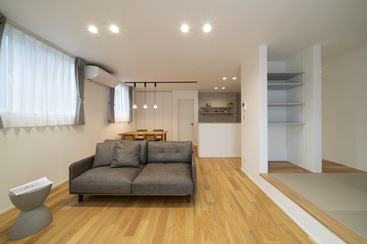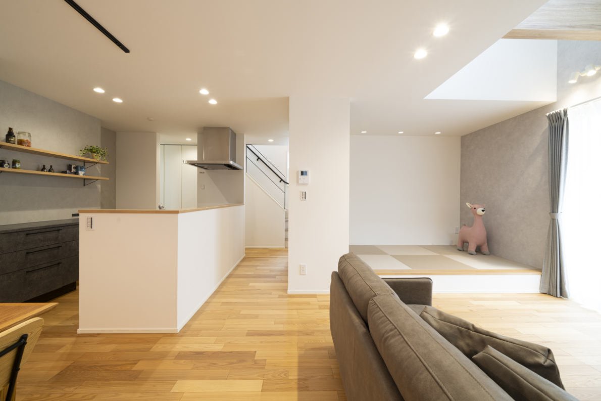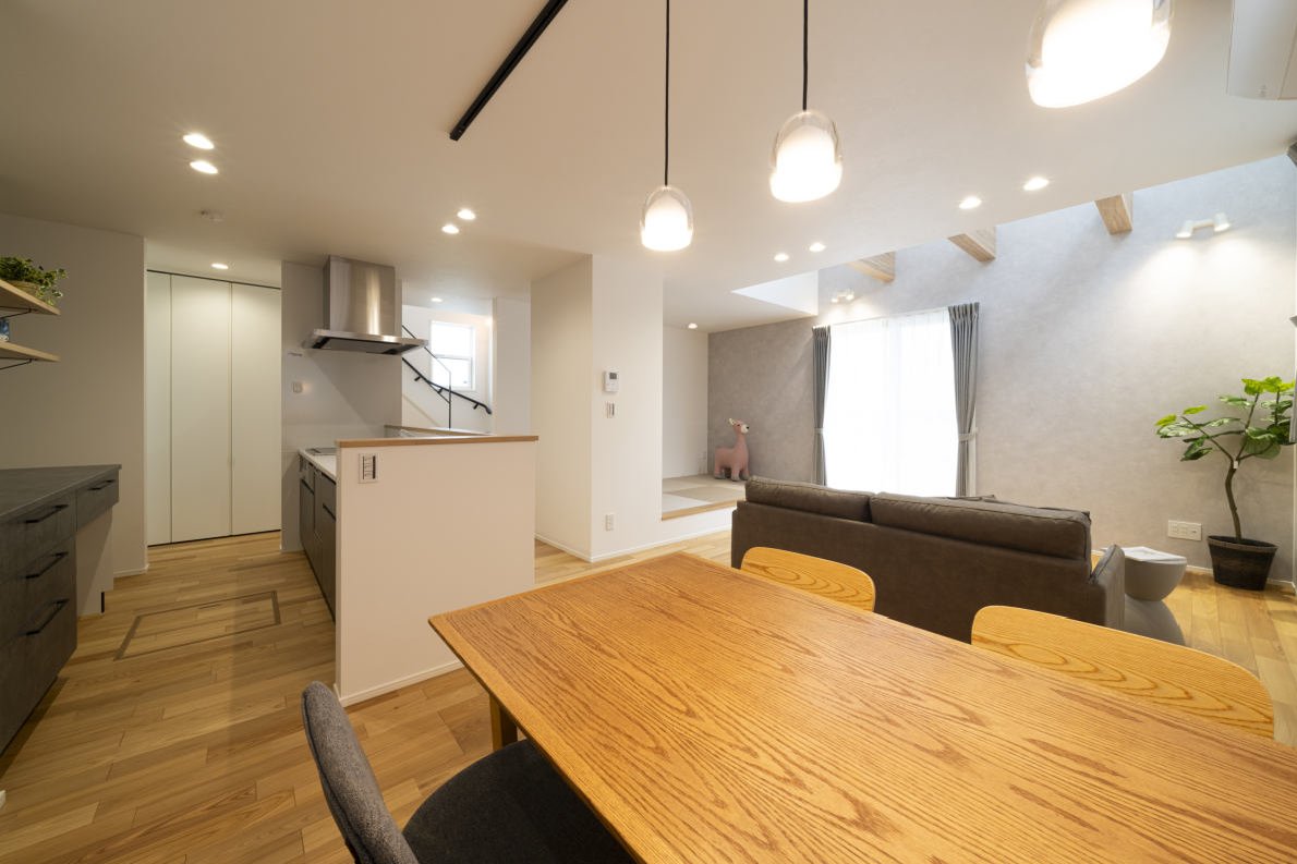 小上がり和室と合わせて約20帖のLDK空間は、リビング上部に梁あらわし&吹き抜け仕様で見た目の美しさと快適さを兼ね備えた空間に仕上がりました。
