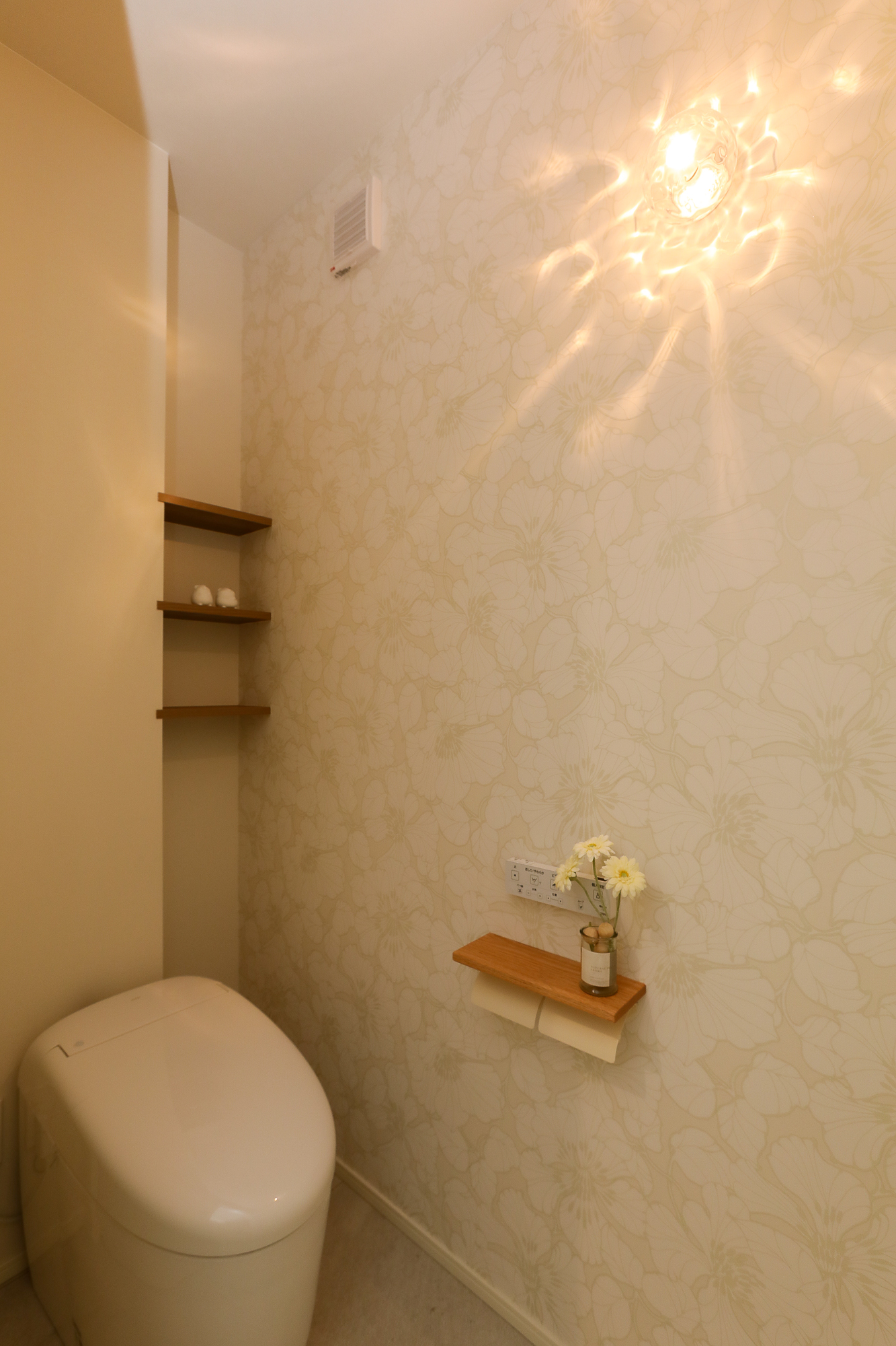 キッチンには大きな食器棚が備えられ、横には書類などを収納できる棚が配置されており、適材適所の収納スペースが確保。
