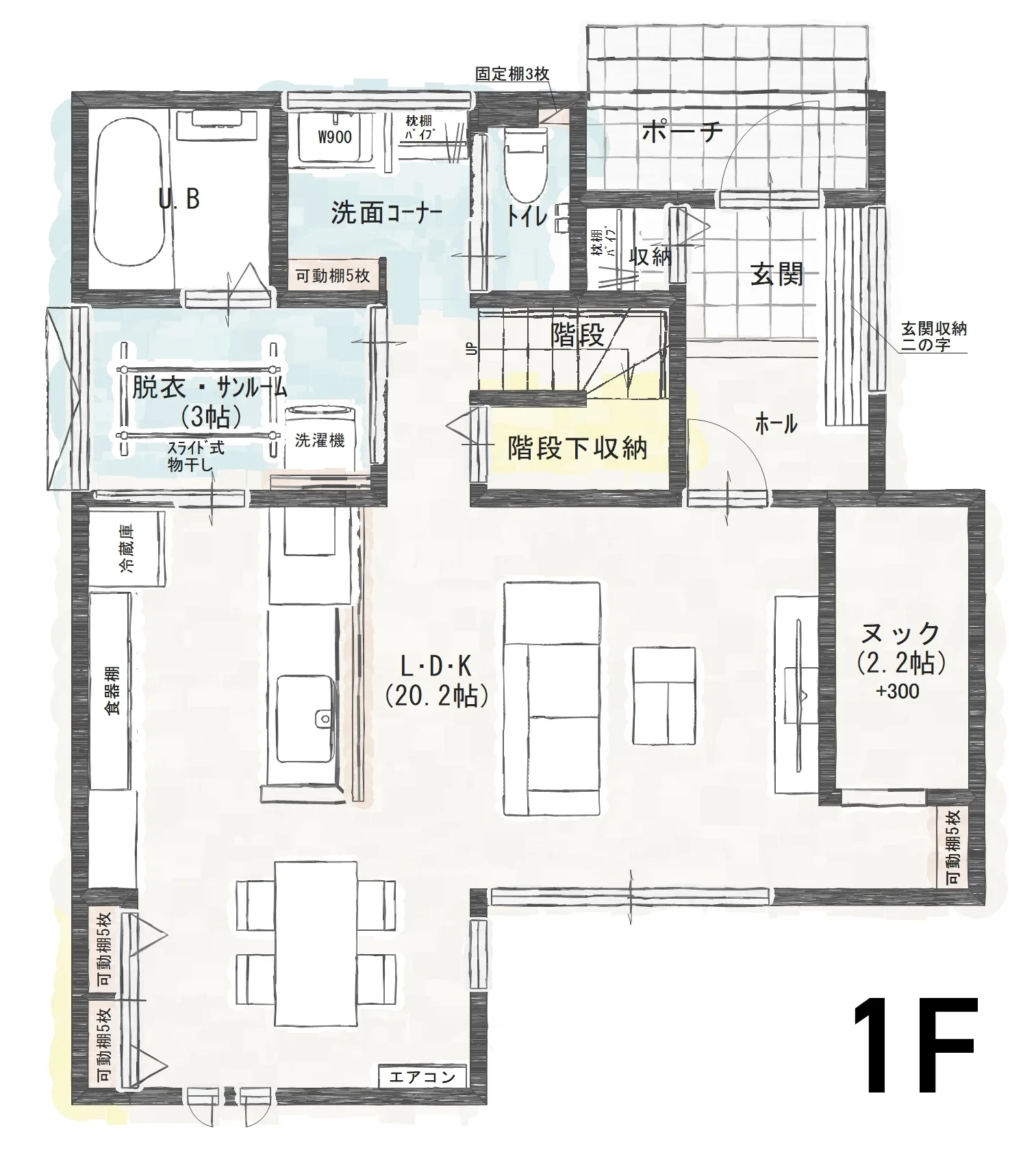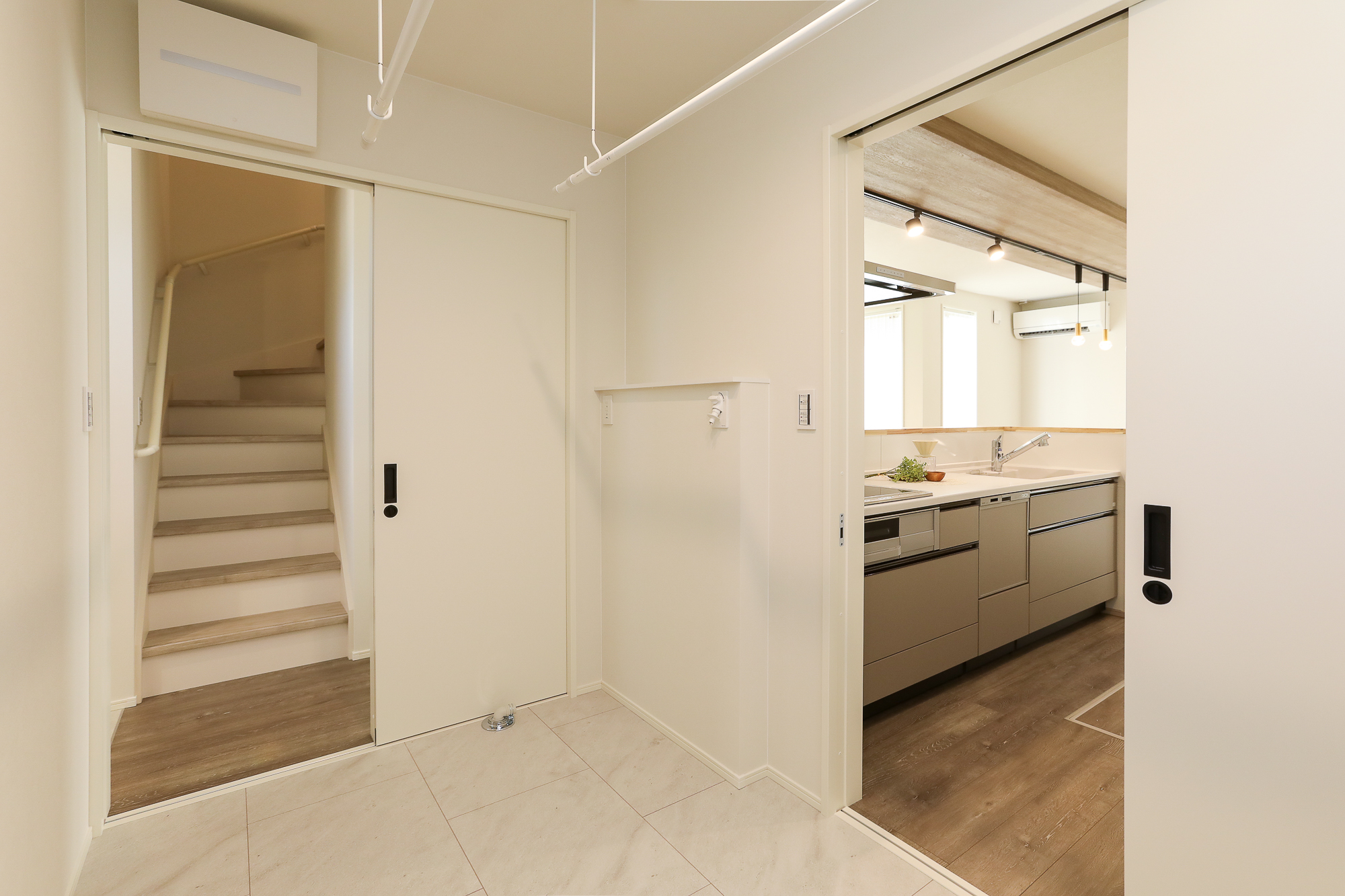 ・サンルームには室内を広く使えるようスライド式の物干しを設置。毎日のお洗濯や洗濯物が多い日も安心!