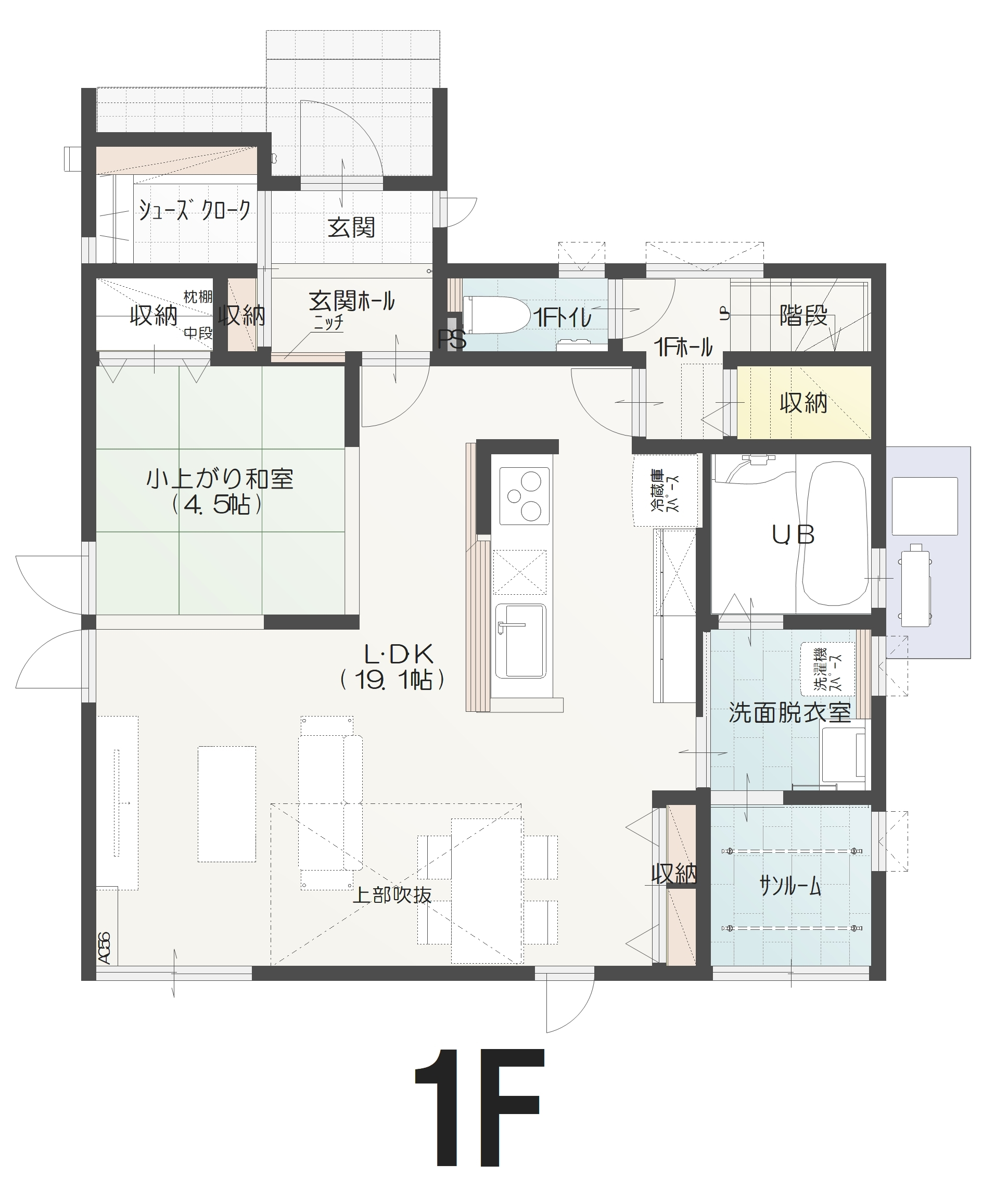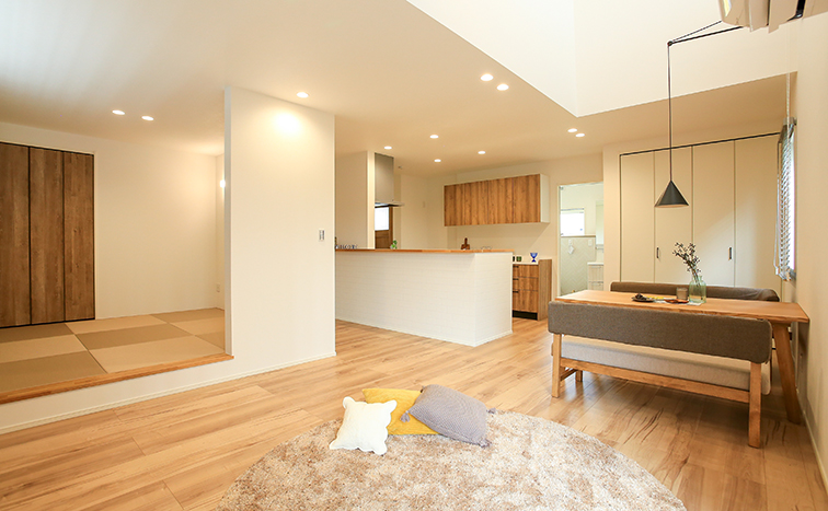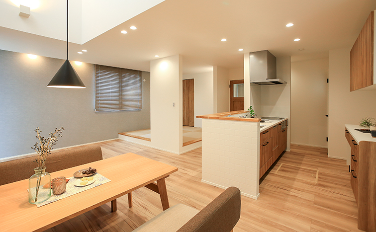LDK19帖+小上がり4.5帖の合わせて23.5帖の広々大空間!キッチンは使いやすいペニンシュラ型にし、キッチンに立てばリビングと和室を見渡せるので、安心です♪雨の多い北陸には必須のサンルームも完備。洗濯物が多い日もバッチリです。