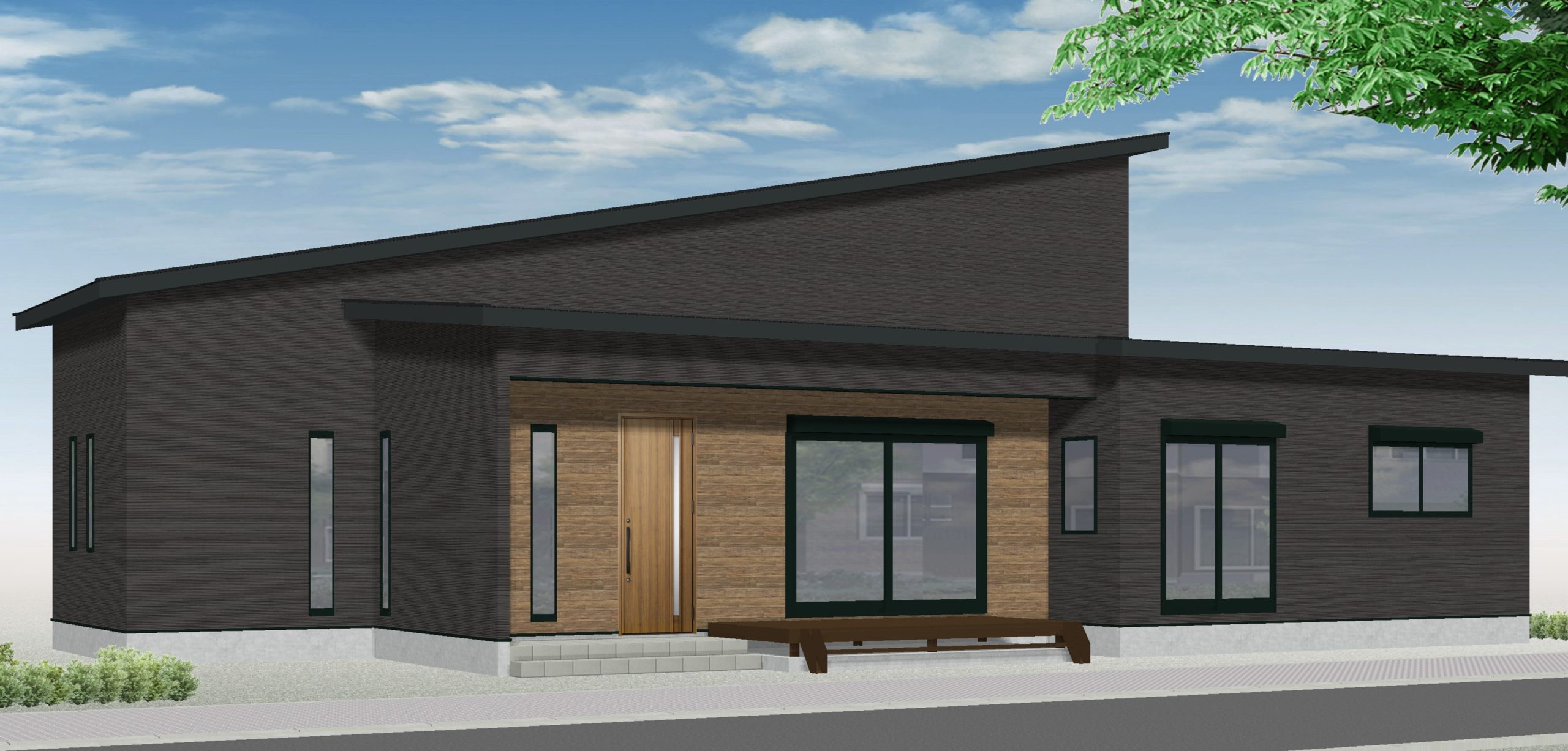ブラックと木目が映えるモダンな外観に仕上がりました。