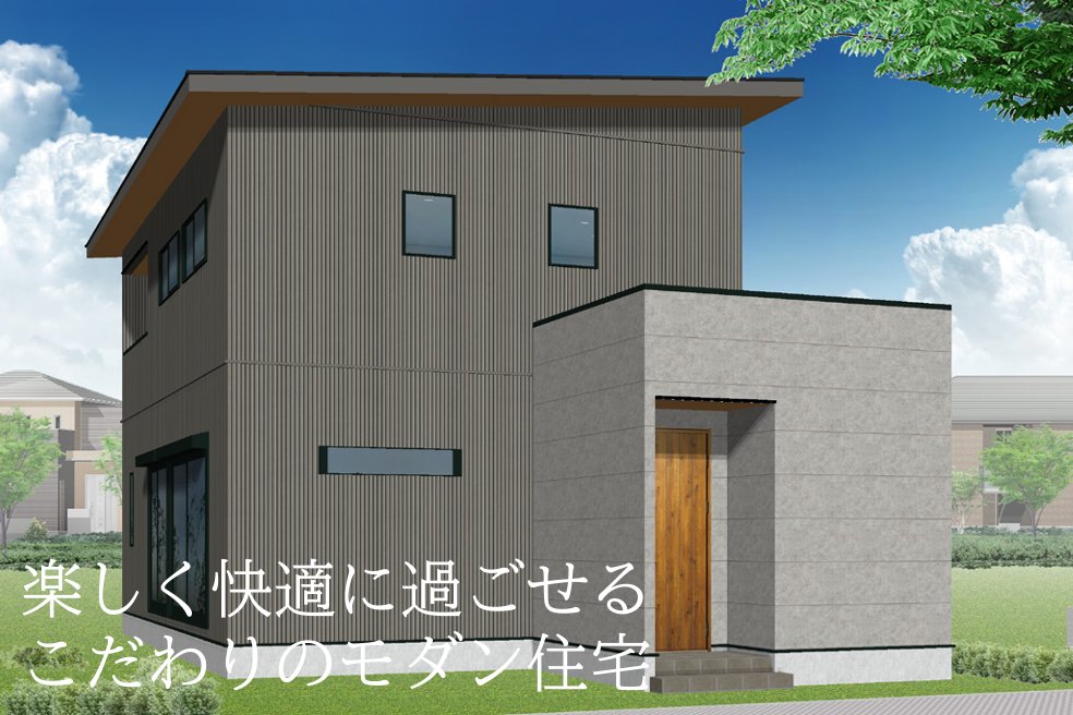 リビングの折上天井+化粧梁に加えキッチンには下がり天井を施し、家族団らんの楽しい雰囲気が溢れるお住まい。外観はスクエアフォルムにストライプ柄とコンクリート調の外壁が映えるモダンな雰囲気。ZEH水準省エネ住宅がつくる快適な住空間をぜひご体感ください。