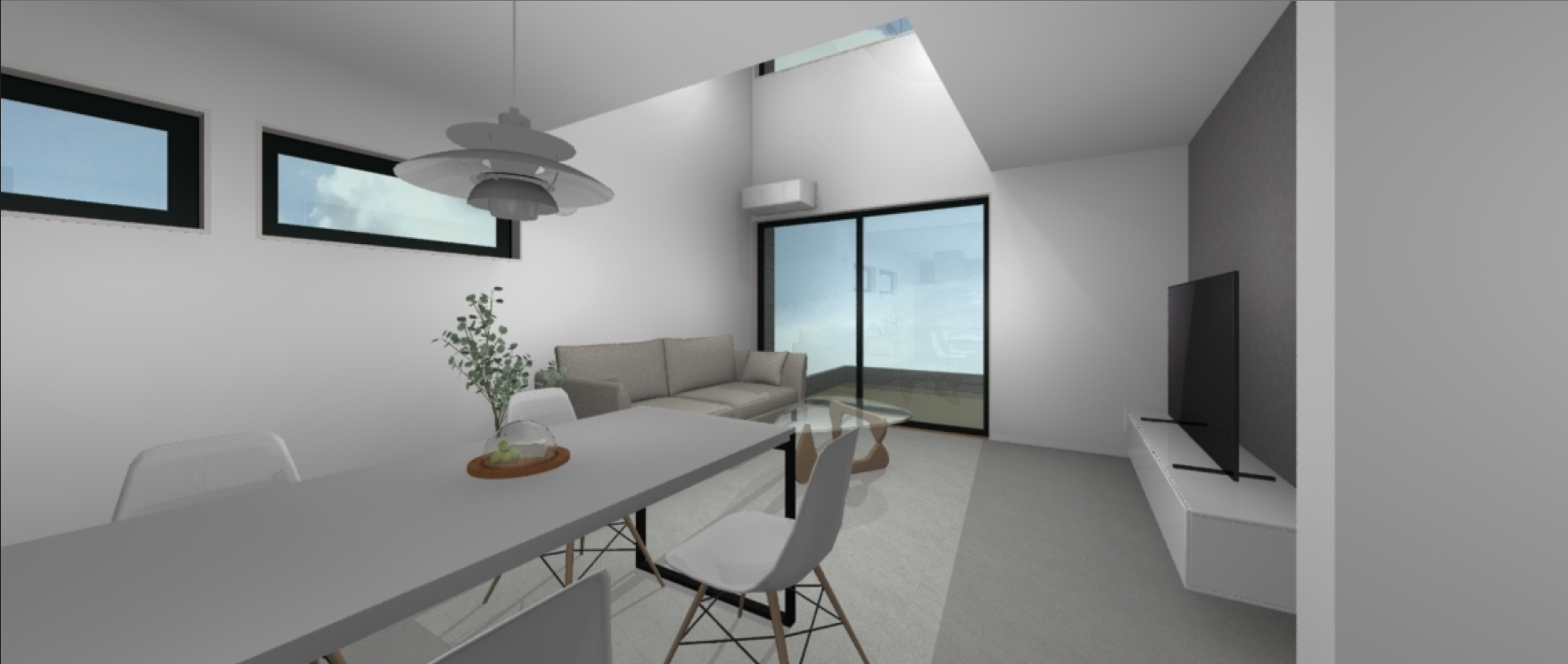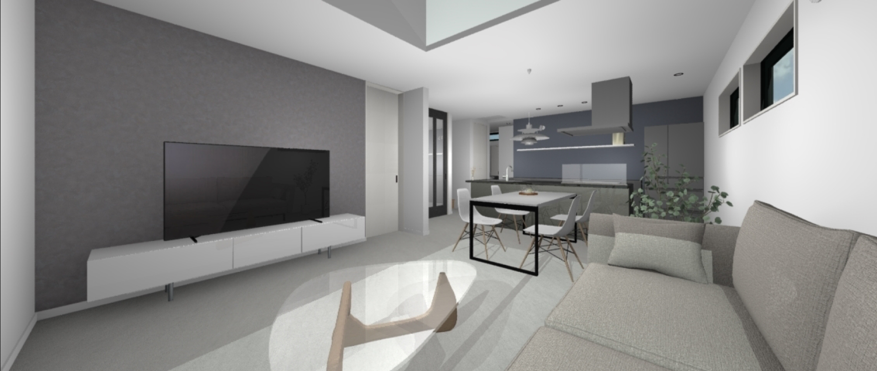 無機質なグレーを基調とした配色に、フラットなアイランドキッチン、大きな吹抜を合わせることで、開放的で現代感のある空間を演出しました。
