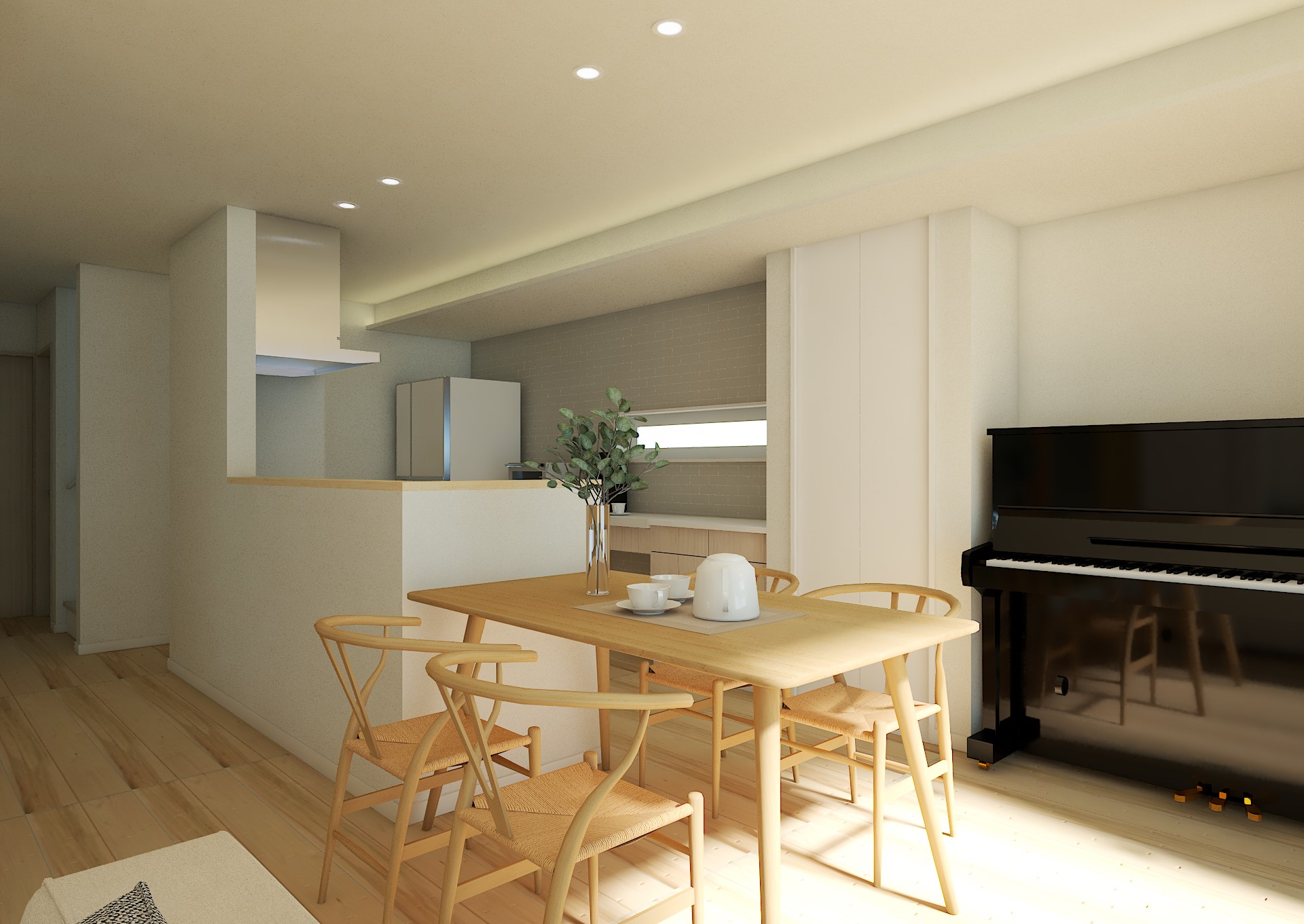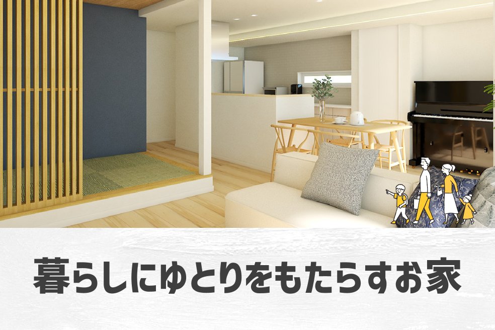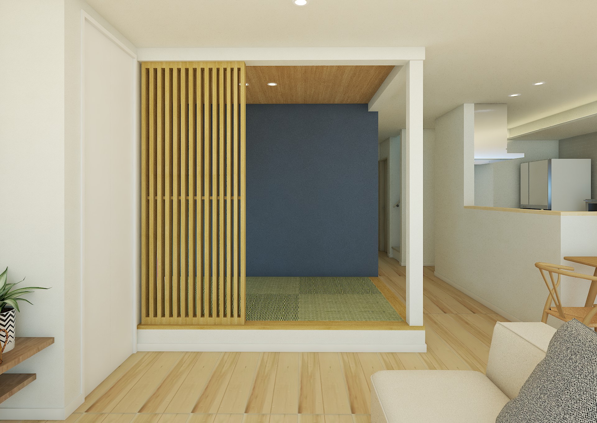 LDKと小上がり和室で23帖のゆとりのある居間には完成照明やデザイン格子を採用し、温かさと落ちつける空間を演出しました