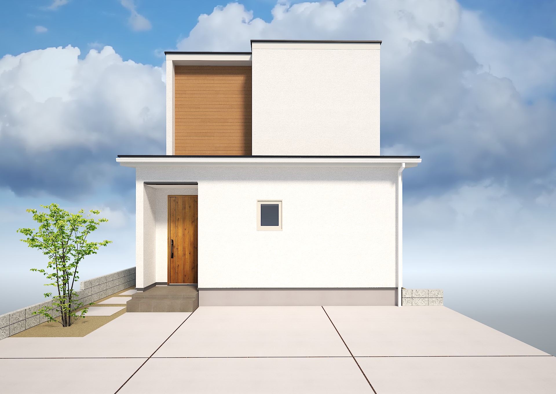 ホワイトの外壁とアクセントで木目を取り入れた、シンプルかつデザイン性のある外観のお家