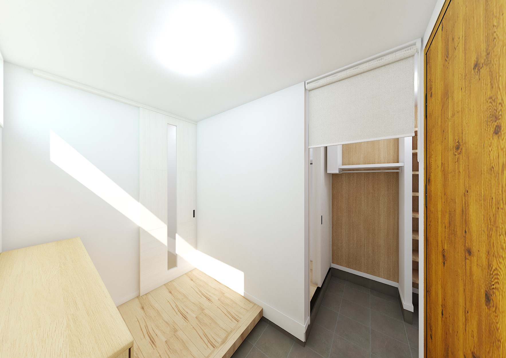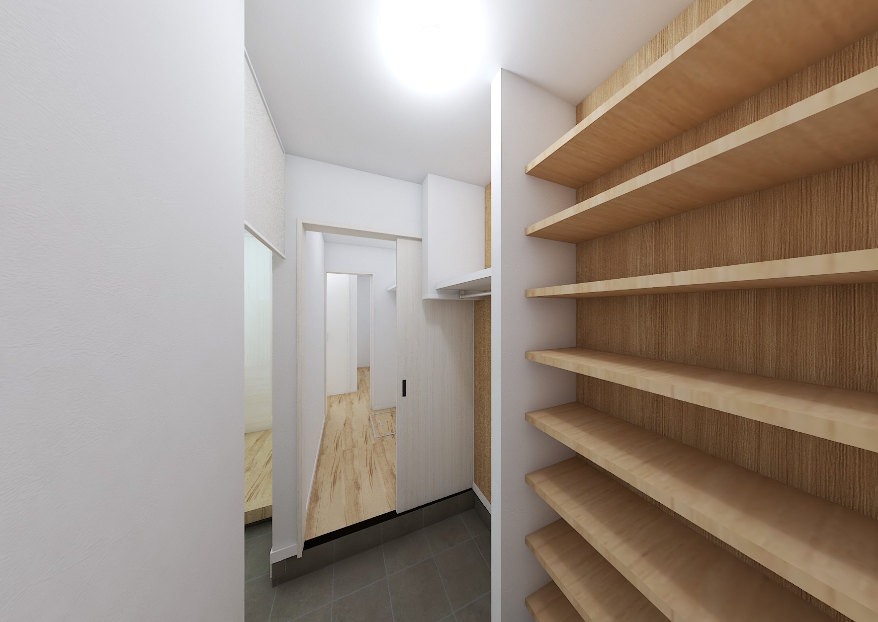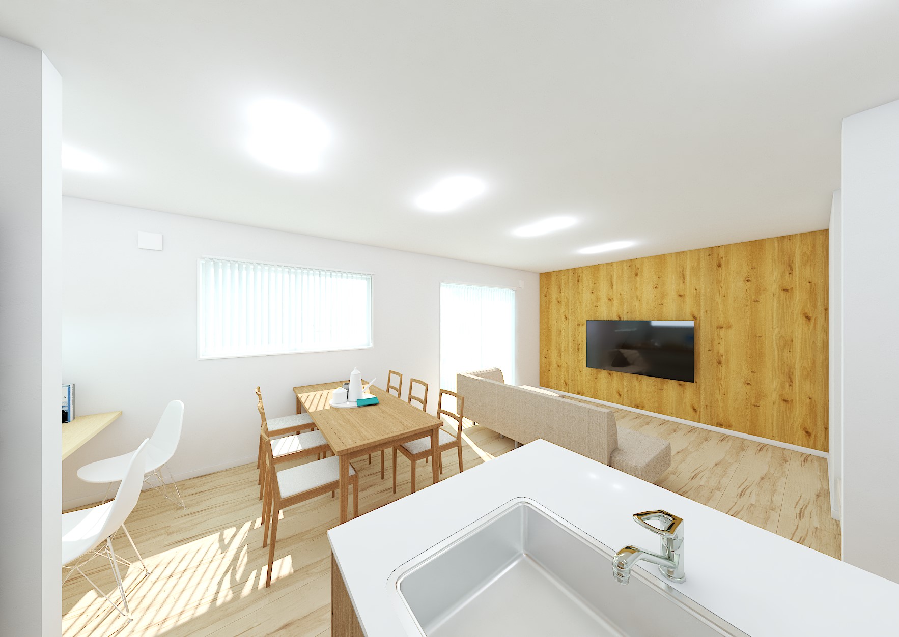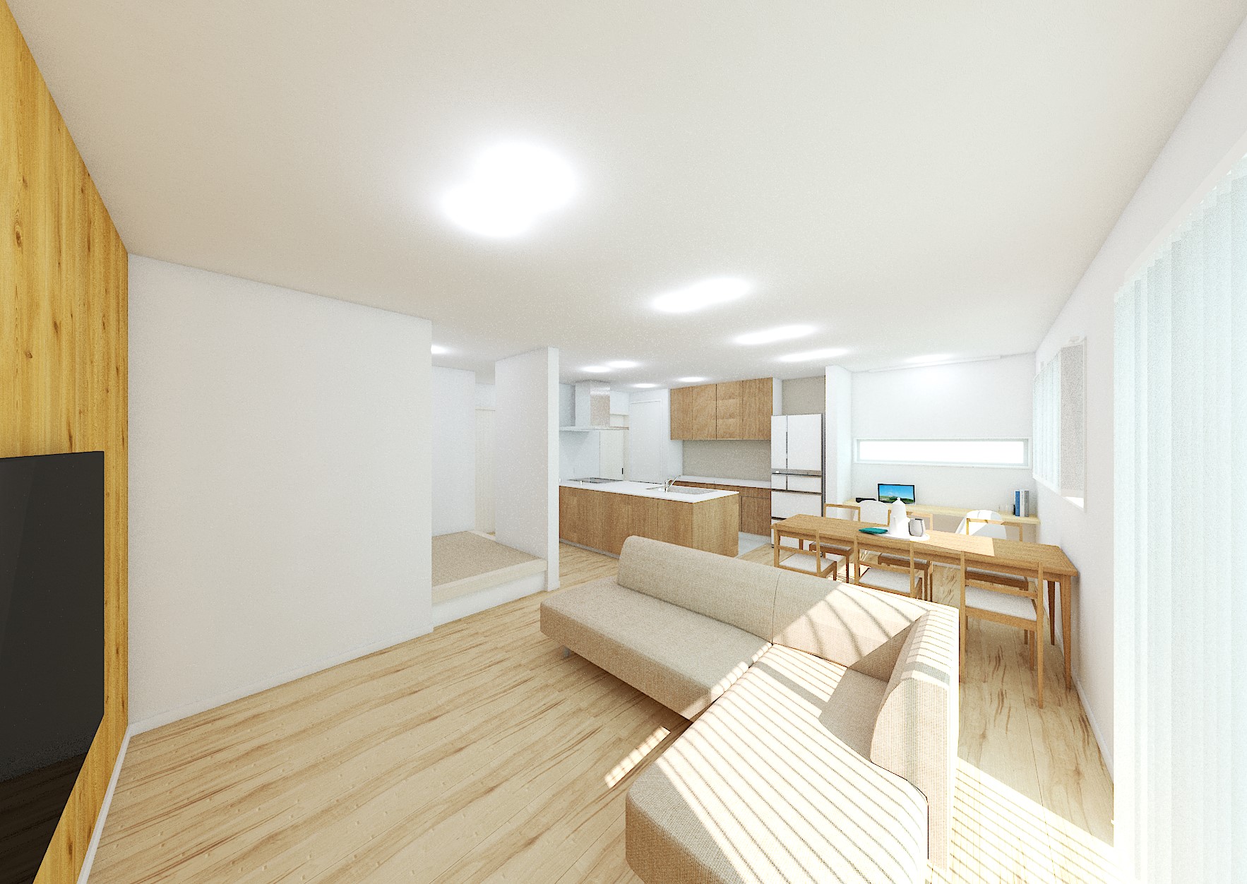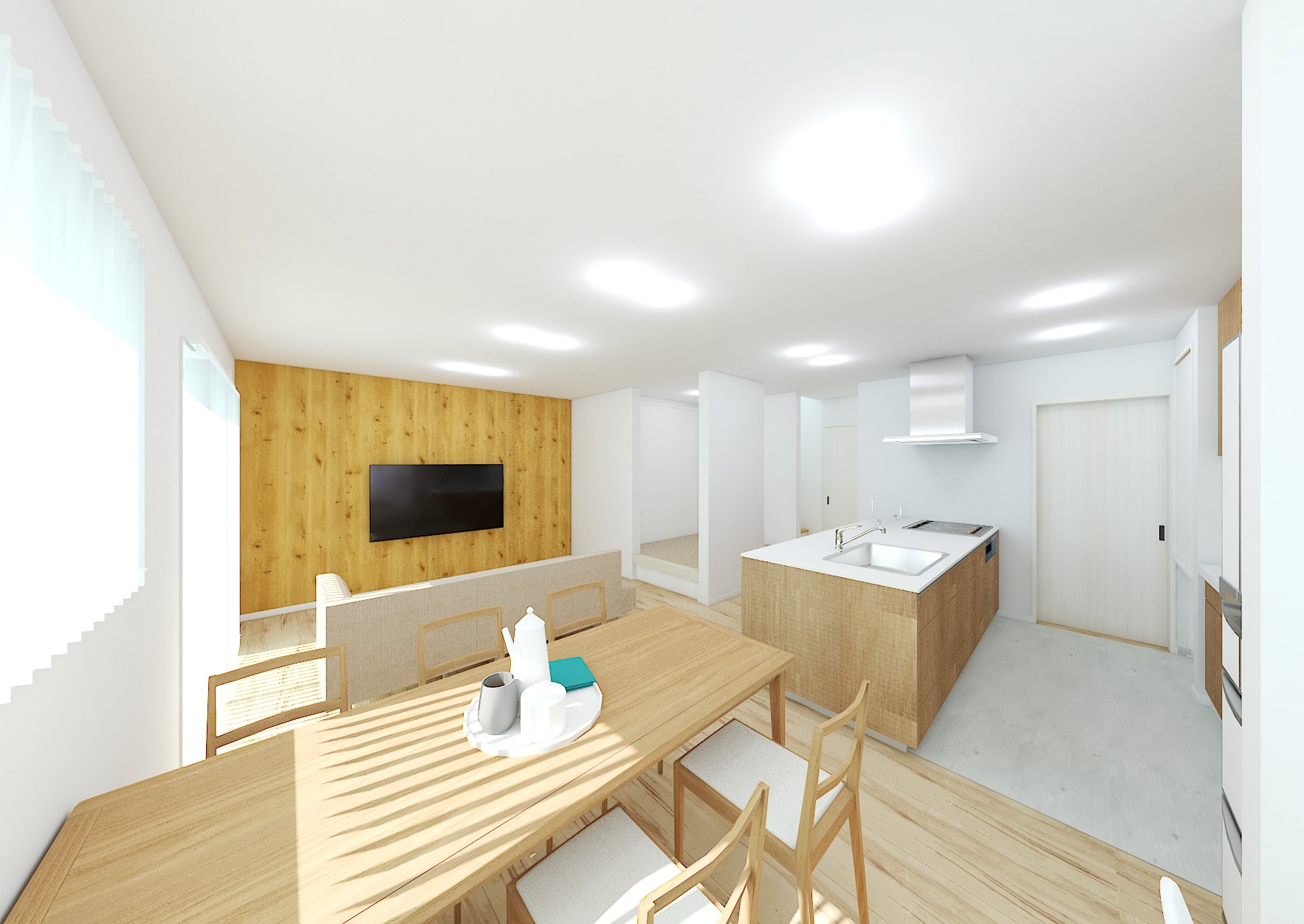 広いオープンキッチンからは家族の様子を伺え、安心してお料理をすることができます。また、玄関・土間収納・ファミリークロークの回遊動線や、水廻りをまとめることで、ストレスフリーの生活が実現いたしました。