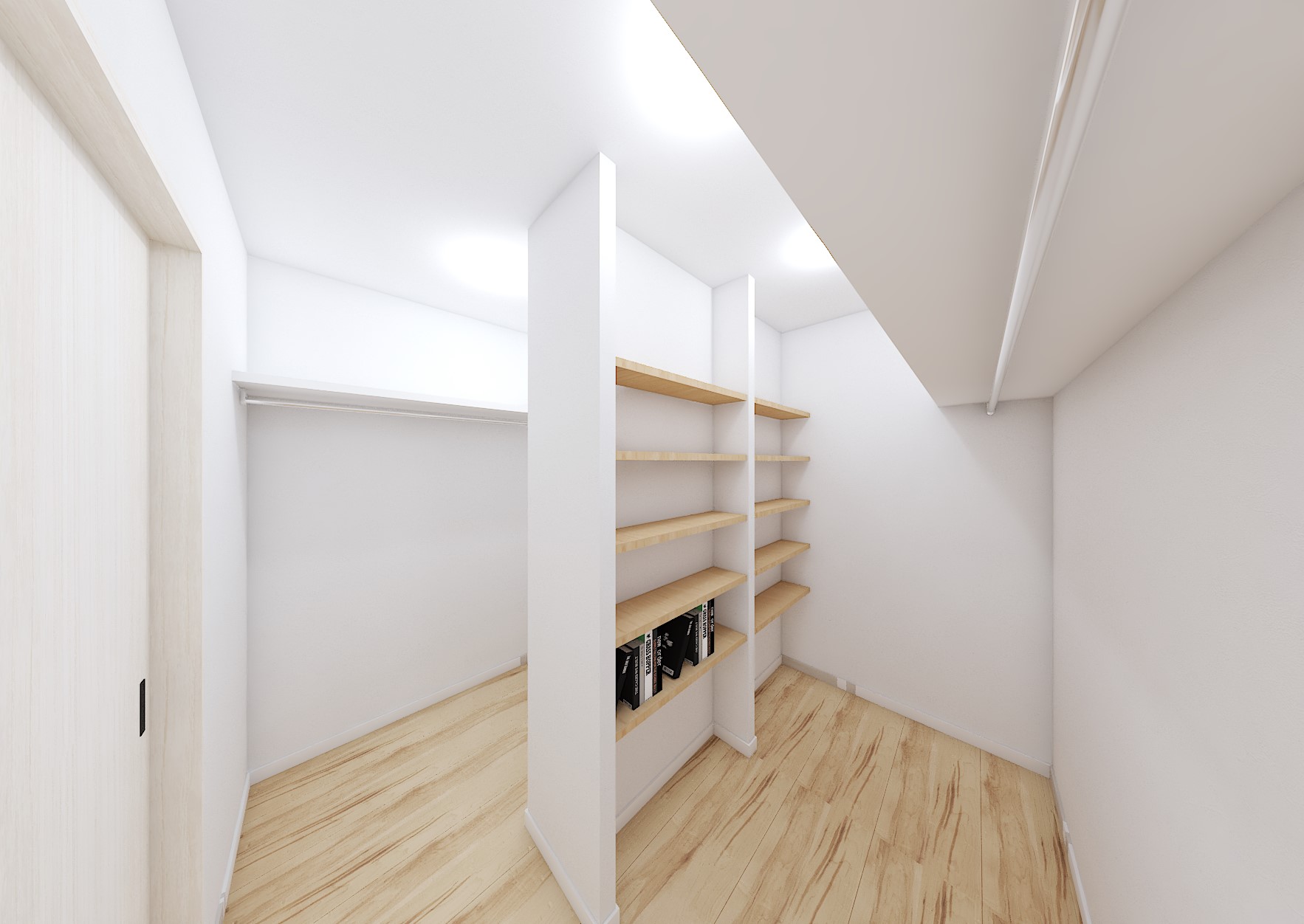 2階のウォークインクローゼットには書籍やDVD等をコレクションできるスペースも◎ご家族のこだわりがたくさん詰まったお家になりました。