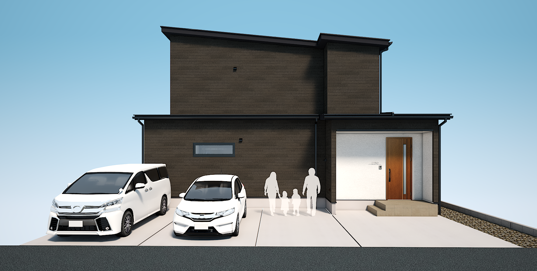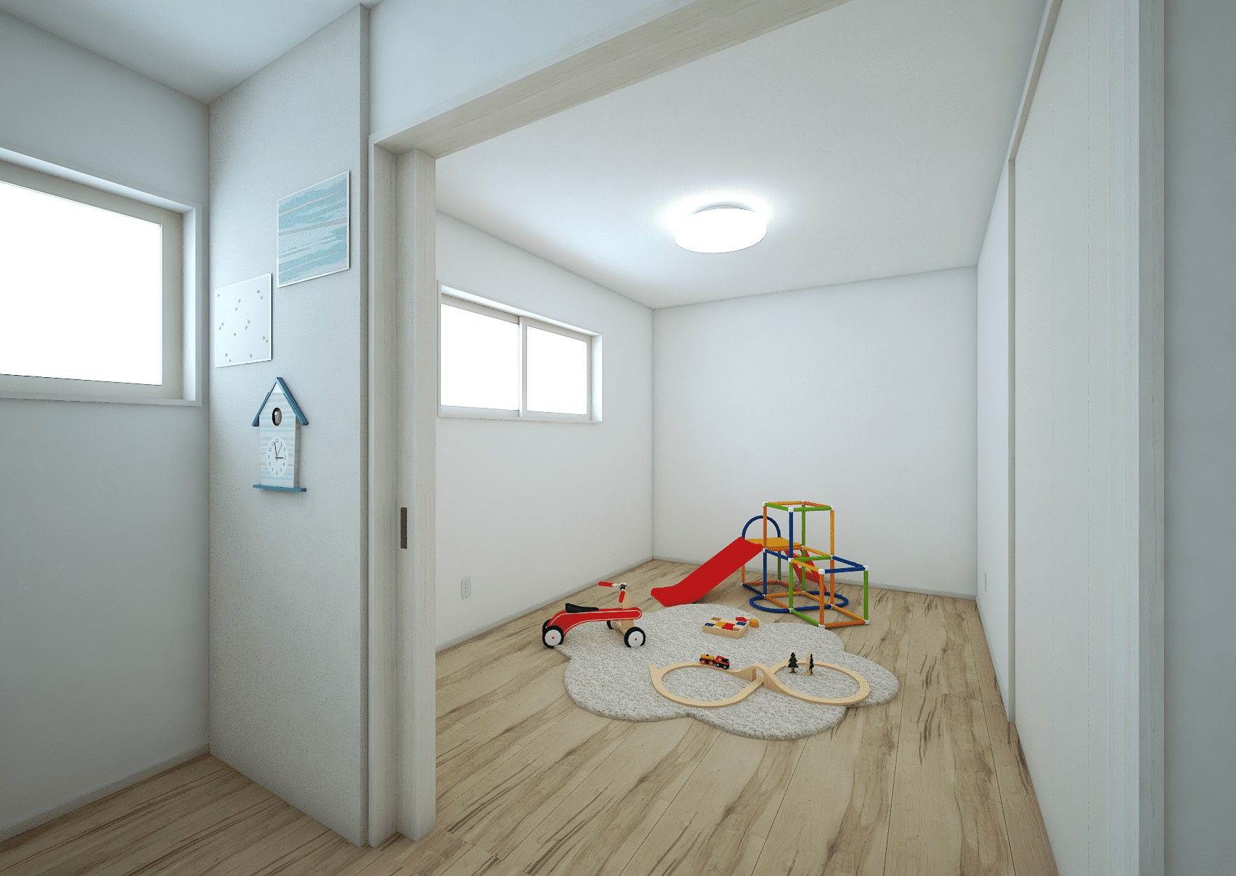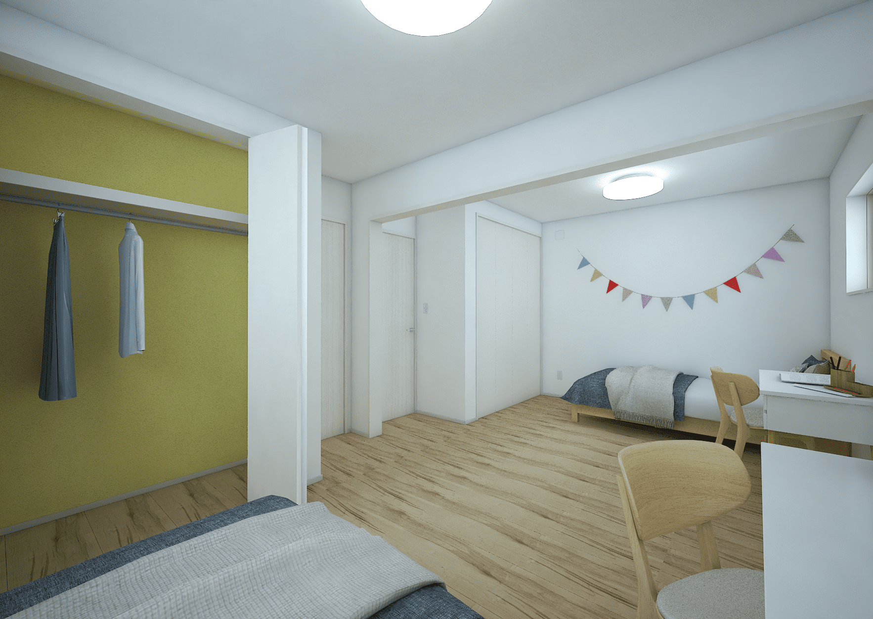 リビング横に洋室を設け、お子様の遊び場、来客スぺース、将来的にはご夫婦の寝室など多目的に利用できます。玄関から手洗い→ファミリークローク→ランドリールームの帰宅動線をつくり、衛生的で着替えもスムーズです。子供室は5.2帖の2部屋を将来的に建具で仕切れるよう隣接させました。