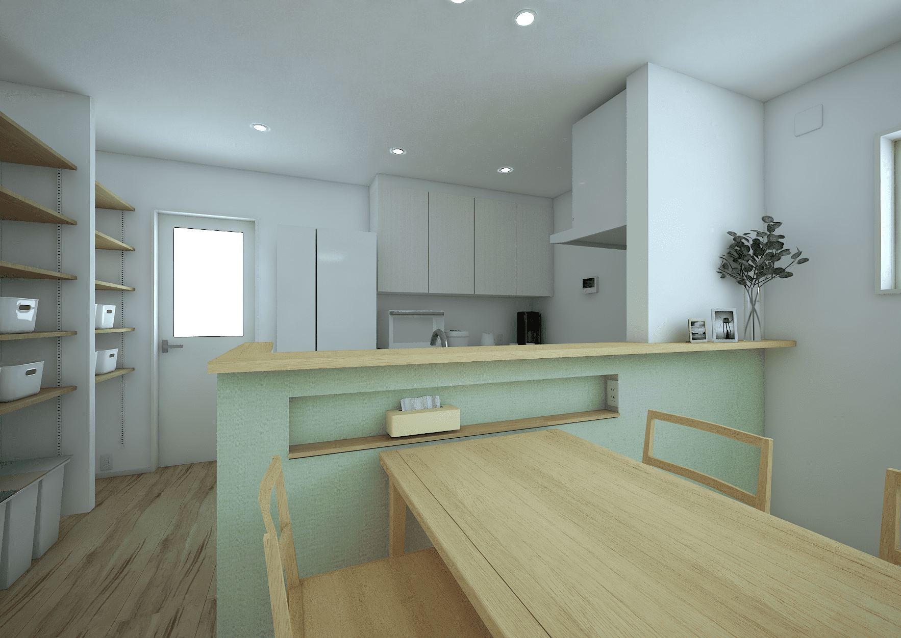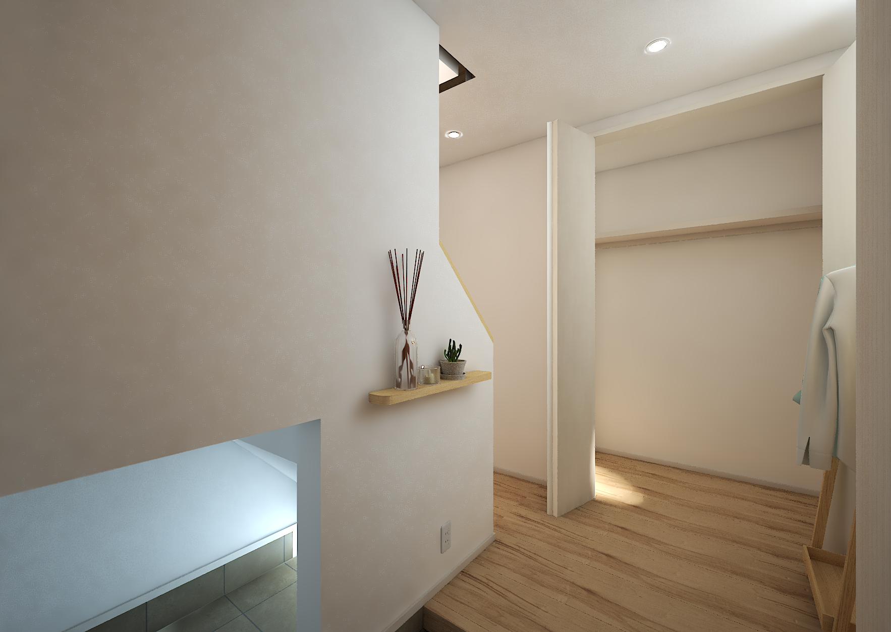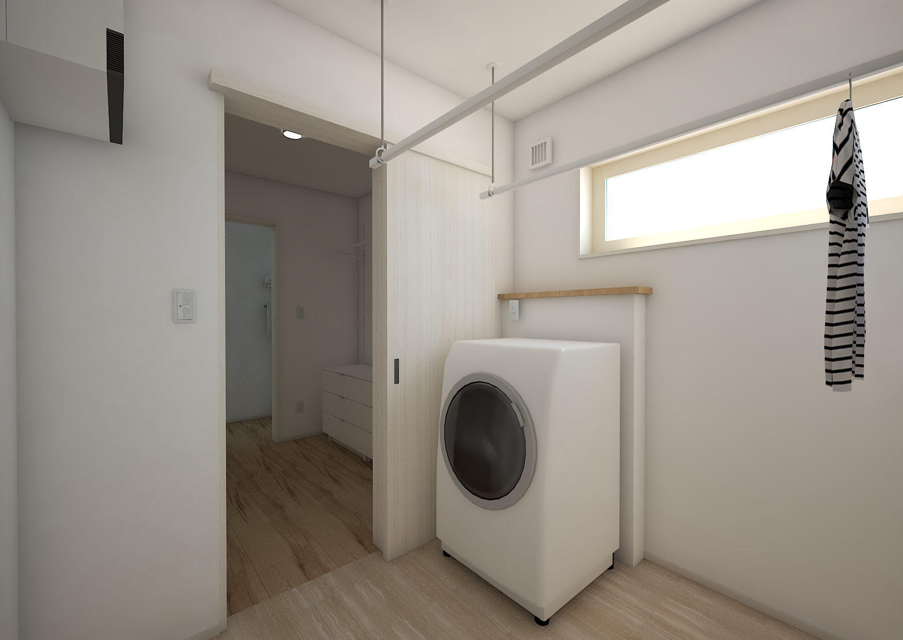 リビング横に洋室を設け、お子様の遊び場、来客スぺース、将来的にはご夫婦の寝室など多目的に利用できます。玄関から手洗い→ファミリークローク→ランドリールームの帰宅動線をつくり、衛生的で着替えもスムーズです。子供室は5.2帖の2部屋を将来的に建具で仕切れるよう隣接させました。
