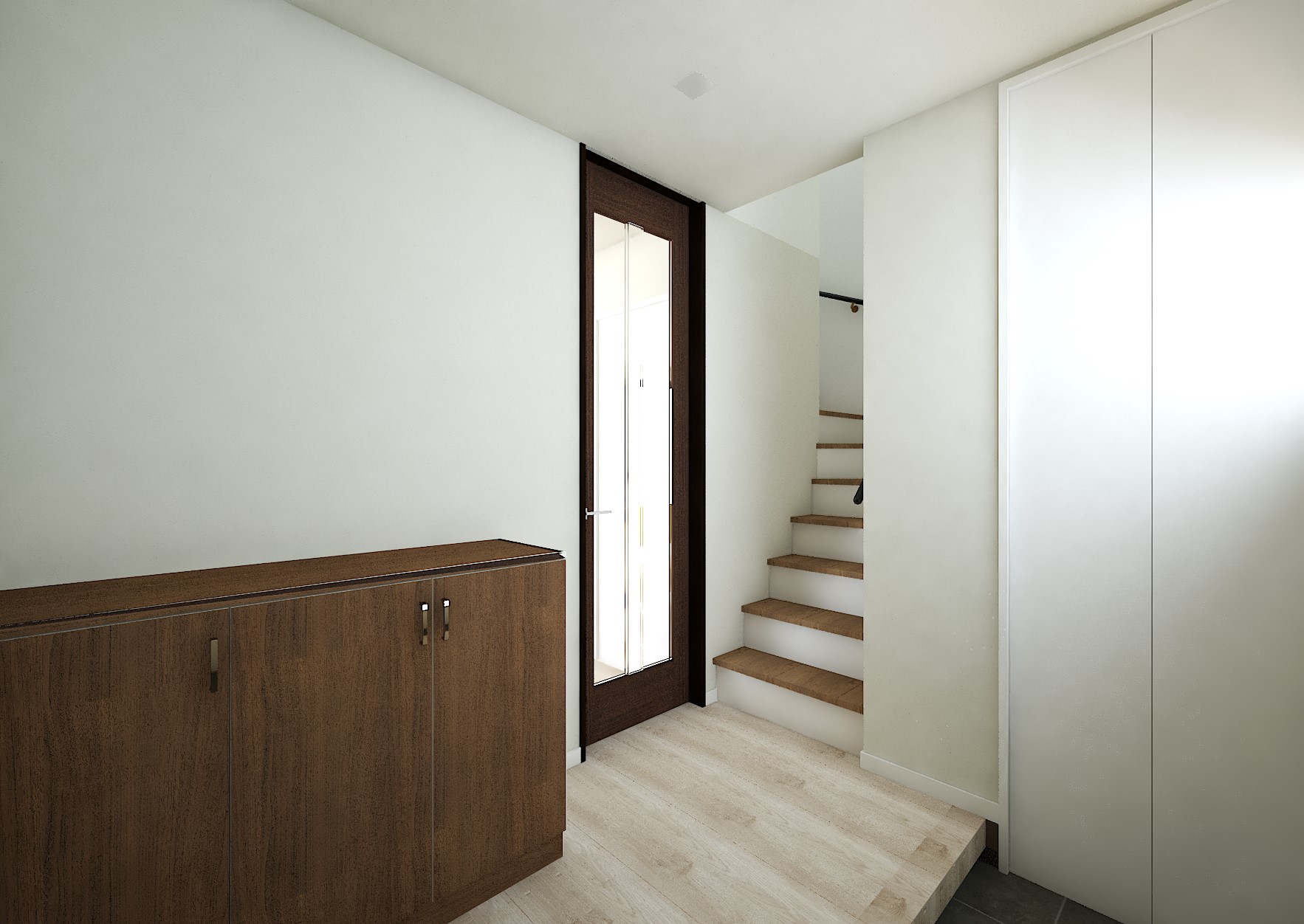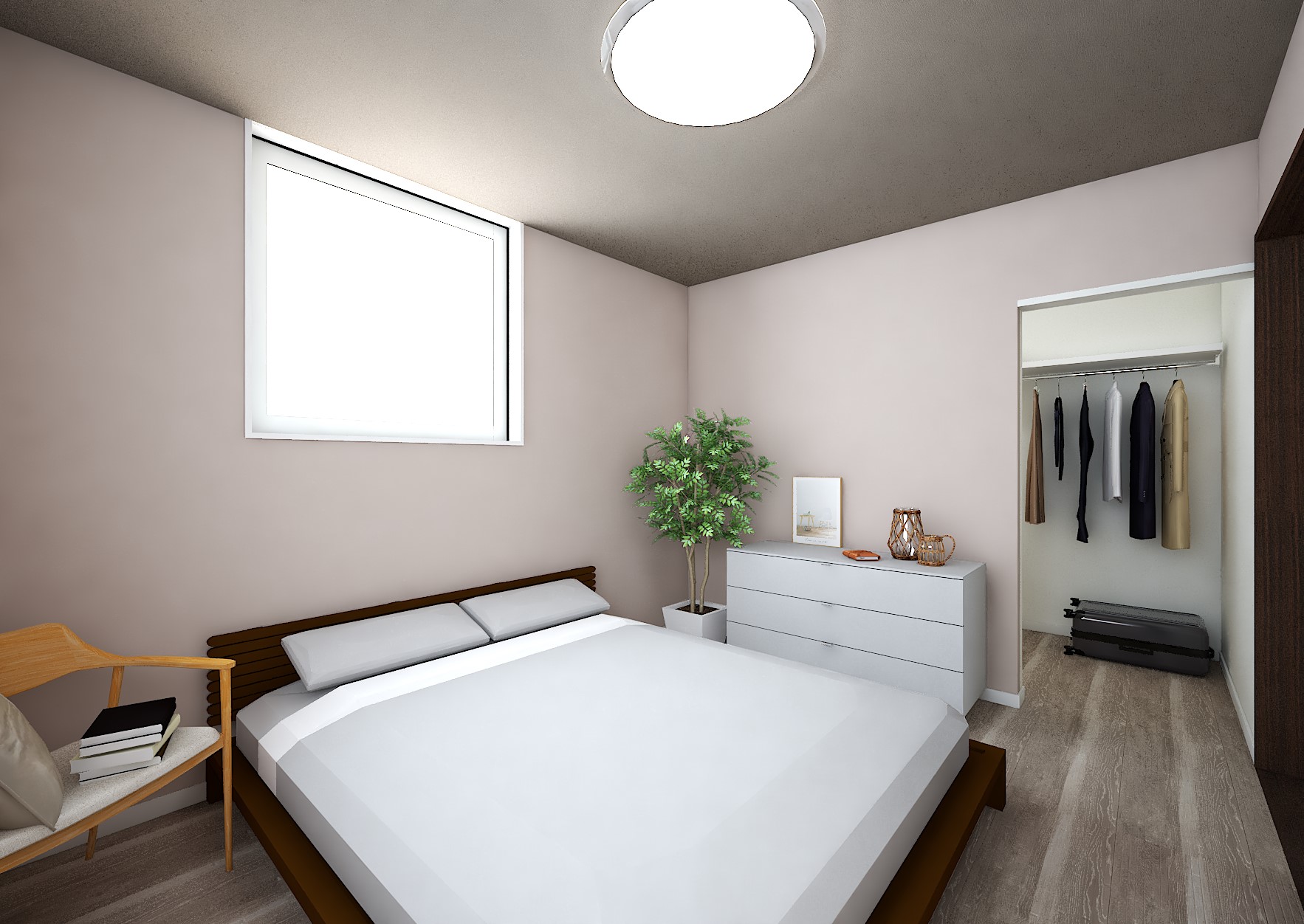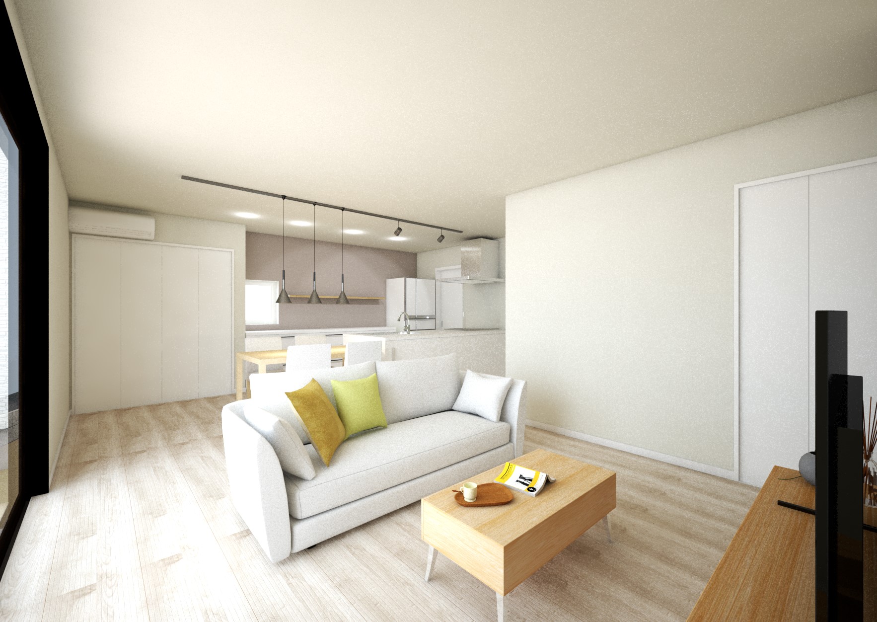 18帖の広々LDKは、グレー系のフロアの優しい色づかいのお部屋です。シューズクロークやファミリークロークなど、収納スペースも充実。書斎もありますので一人用のスペースが欲しい方は必見◎