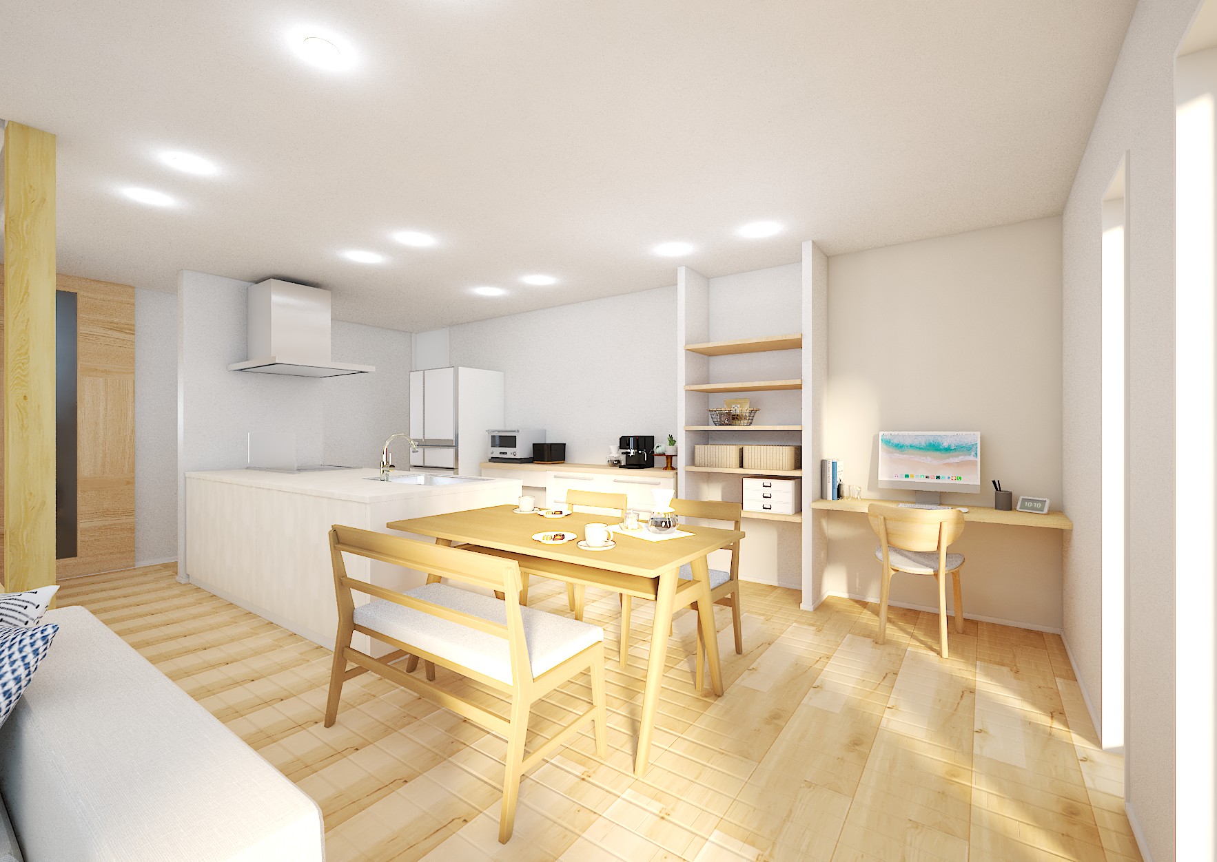 さらに、フルフラットキッチンや造作洗面台、無垢調の床材、小上がり和室といったおしゃれなアイテムも多数取り入れ、住まいの美しさと機能性を両立しています。