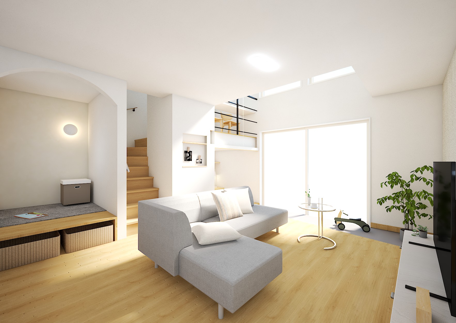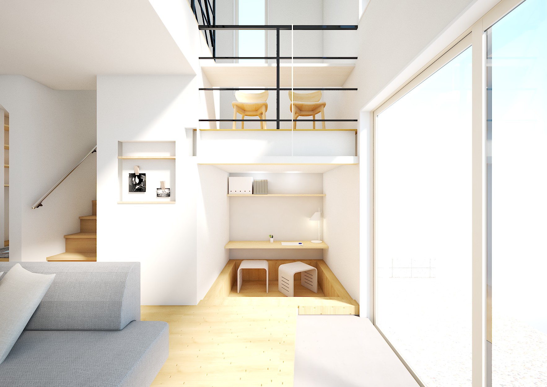 スキップフロアのPCスペースや、その下の勉強スペース、ゆったり本を読めるヌック、日向ぼっこができるリビングの内土間スペースなど、特別な空間を設けました。