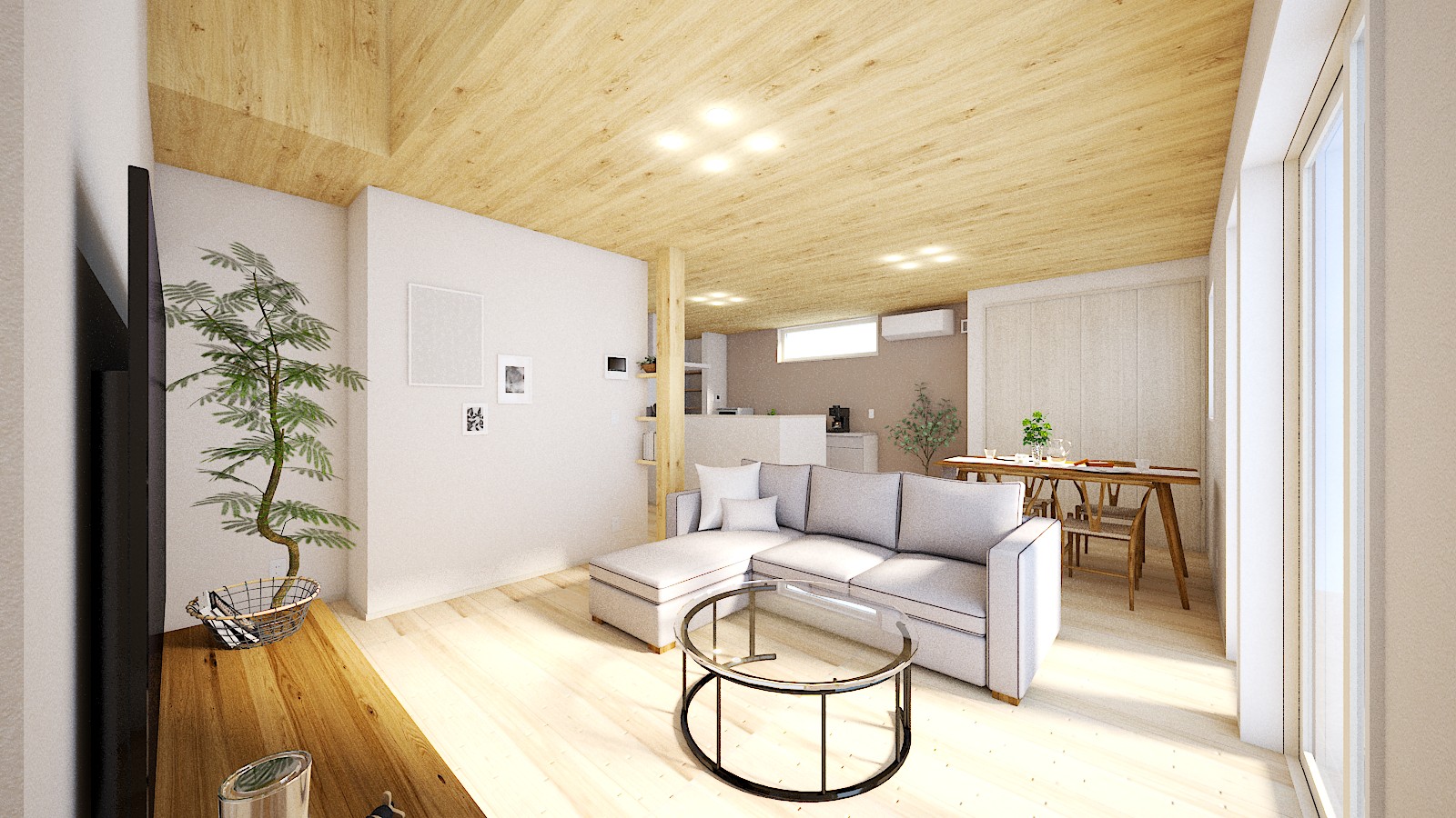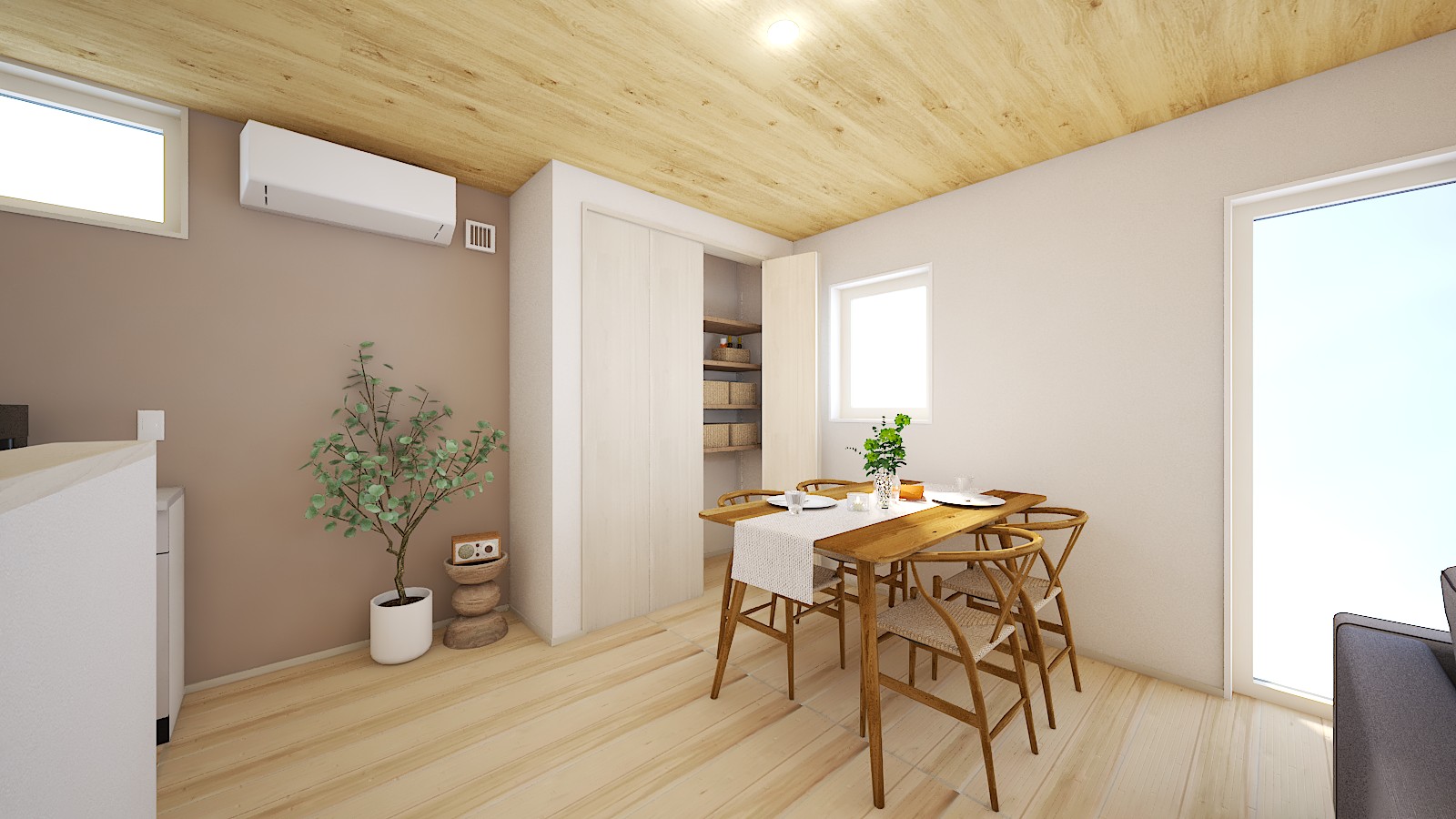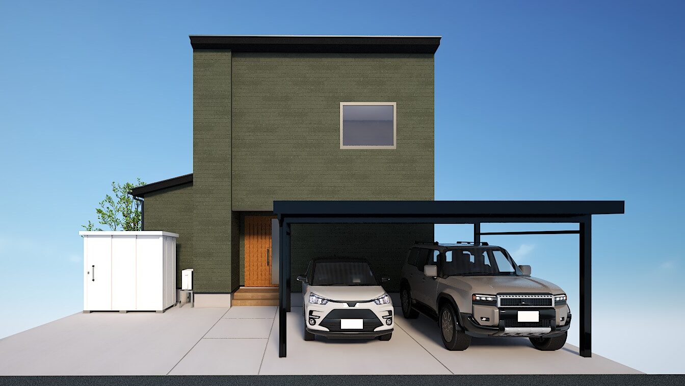 緑の木目がはえるスタイリッシュな外観とナチュラルテイストの内観が見どころのお住まいです。