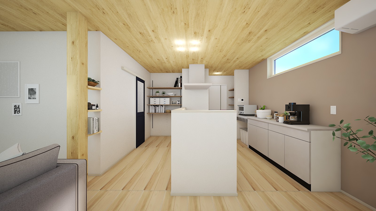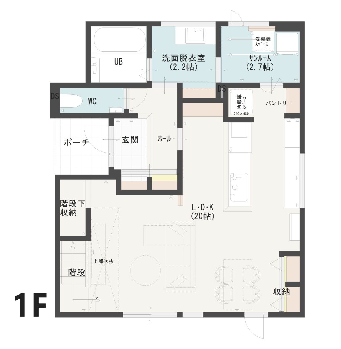 キッチンからすぐにサンルームへといける家事ラク動線や回遊のできるゆとりある動線計画。