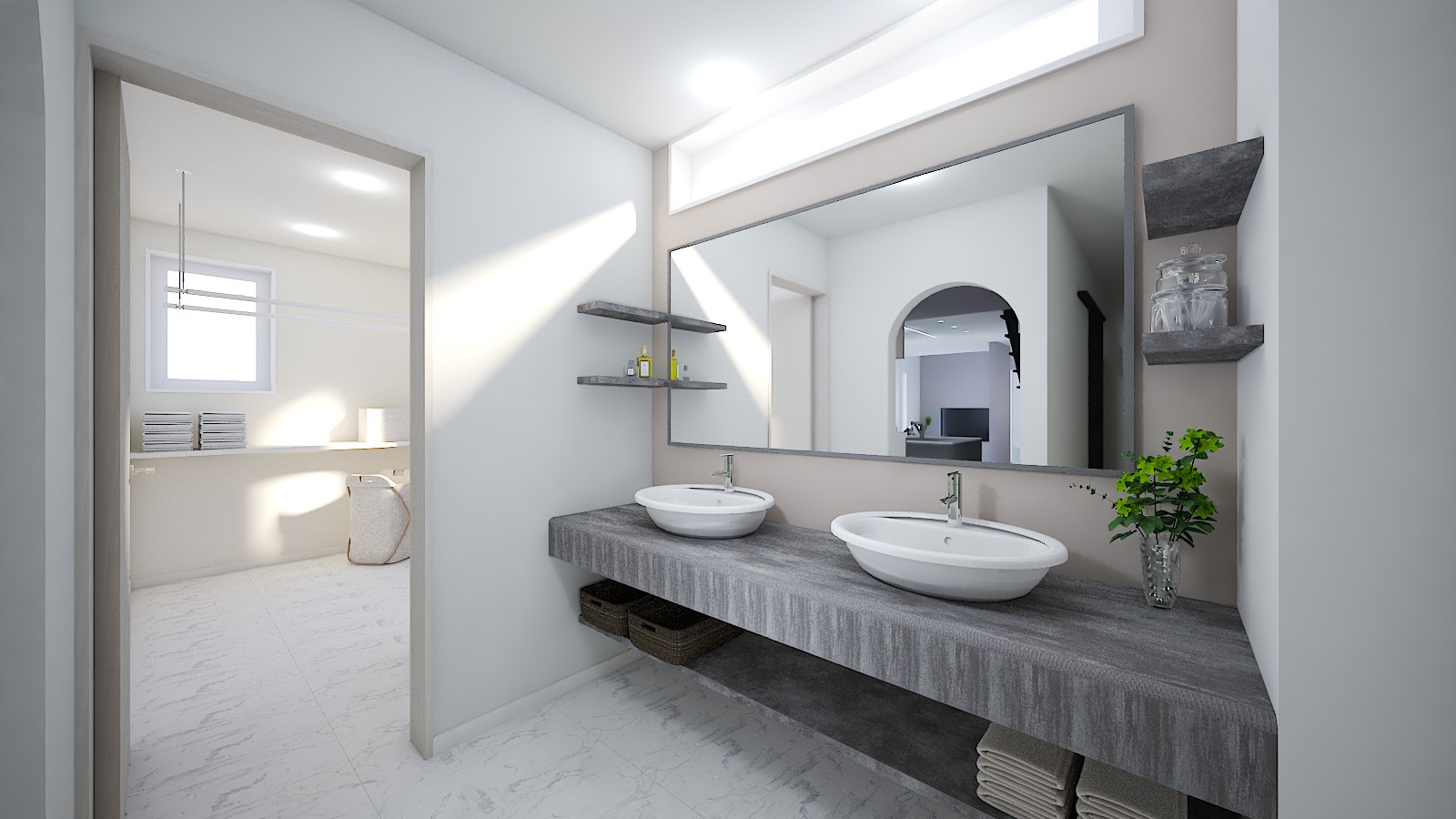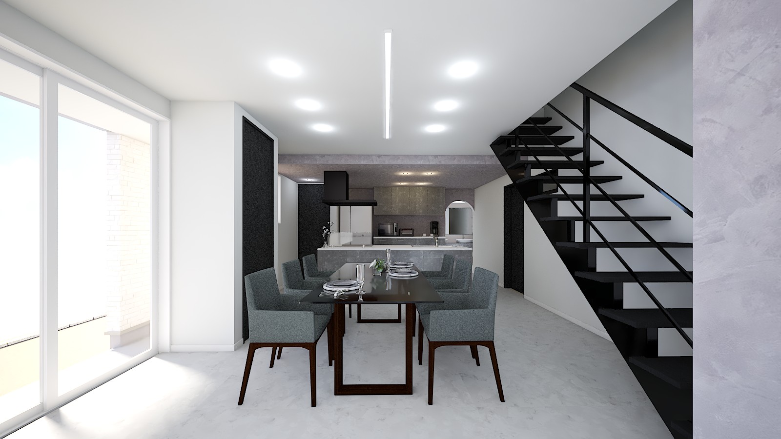 鉄骨階段やダウンリビング、アイランドキッチンに2人並べる造作洗面台など優雅なモデルハウスを思わせる豪華な空間を演出してくれます。