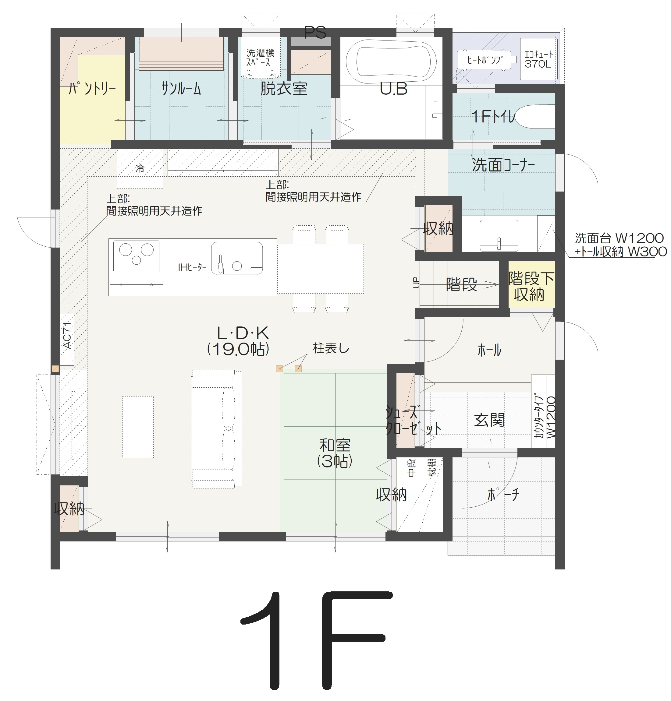 パントリー、サンルーム、脱衣室、お風呂の水回り部分が一直線で、