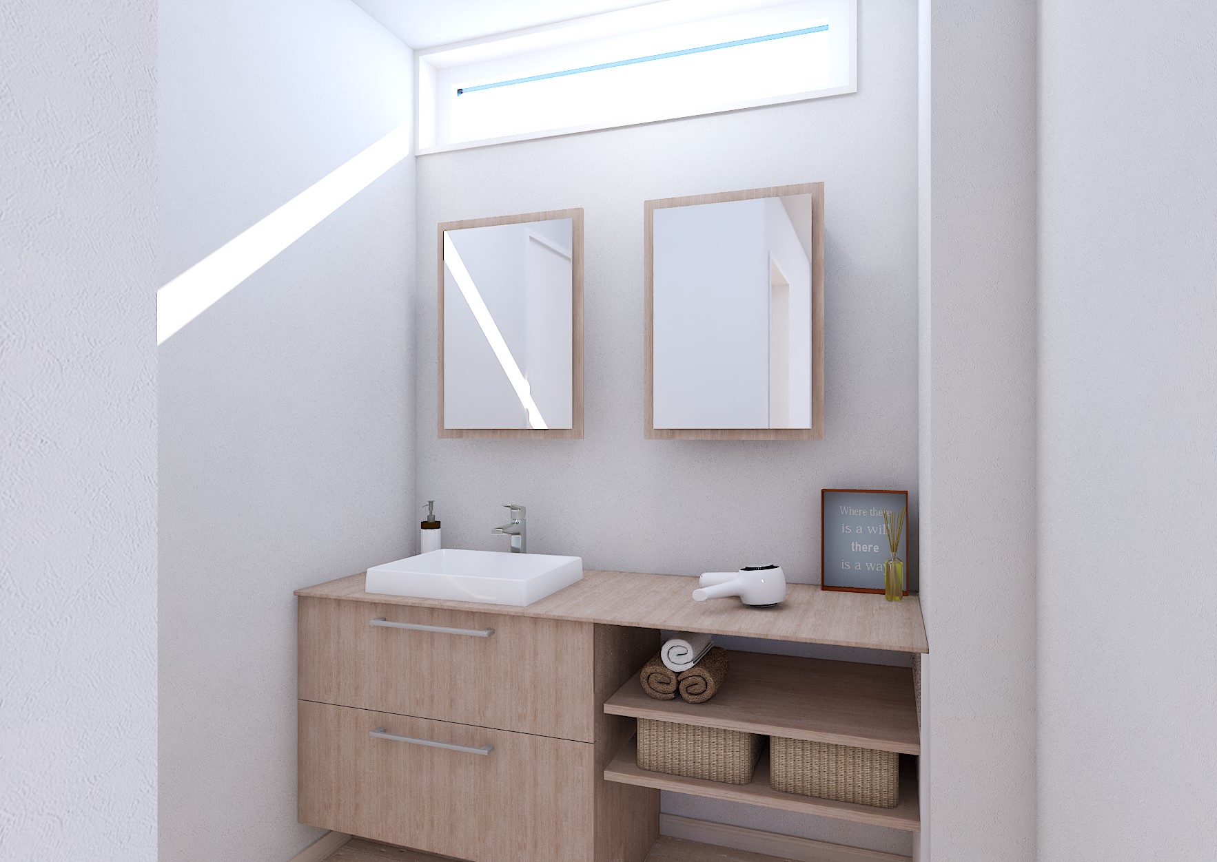掛けTVや造作ニッチ、R下がり壁、二人並べるワイドな洗面台などオリジナルアイディアが詰まっています。