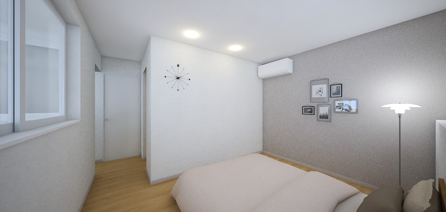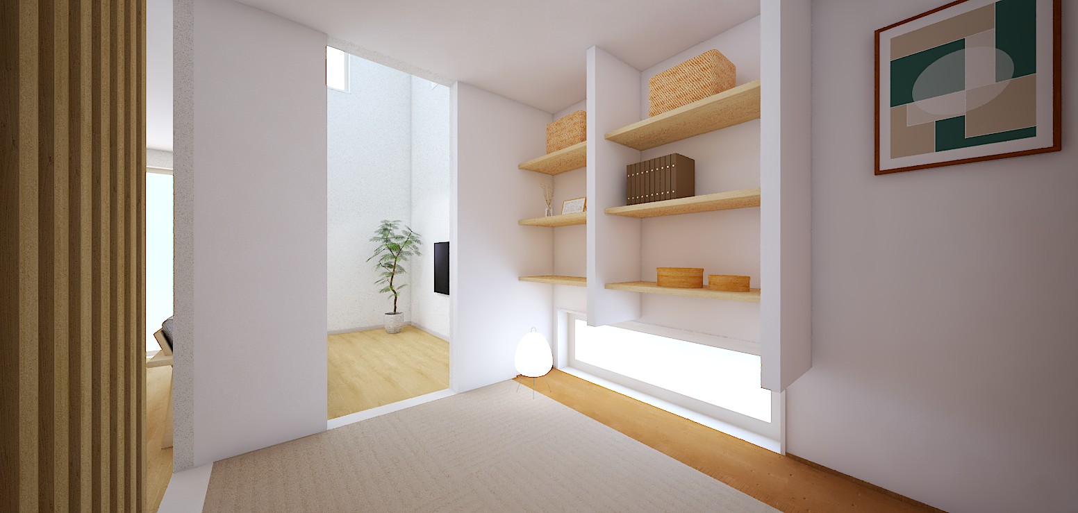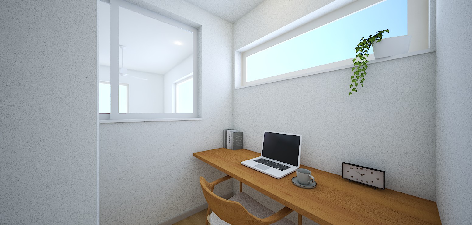 ✅吹抜けと繋がる窓のある寝室、ワークスペース