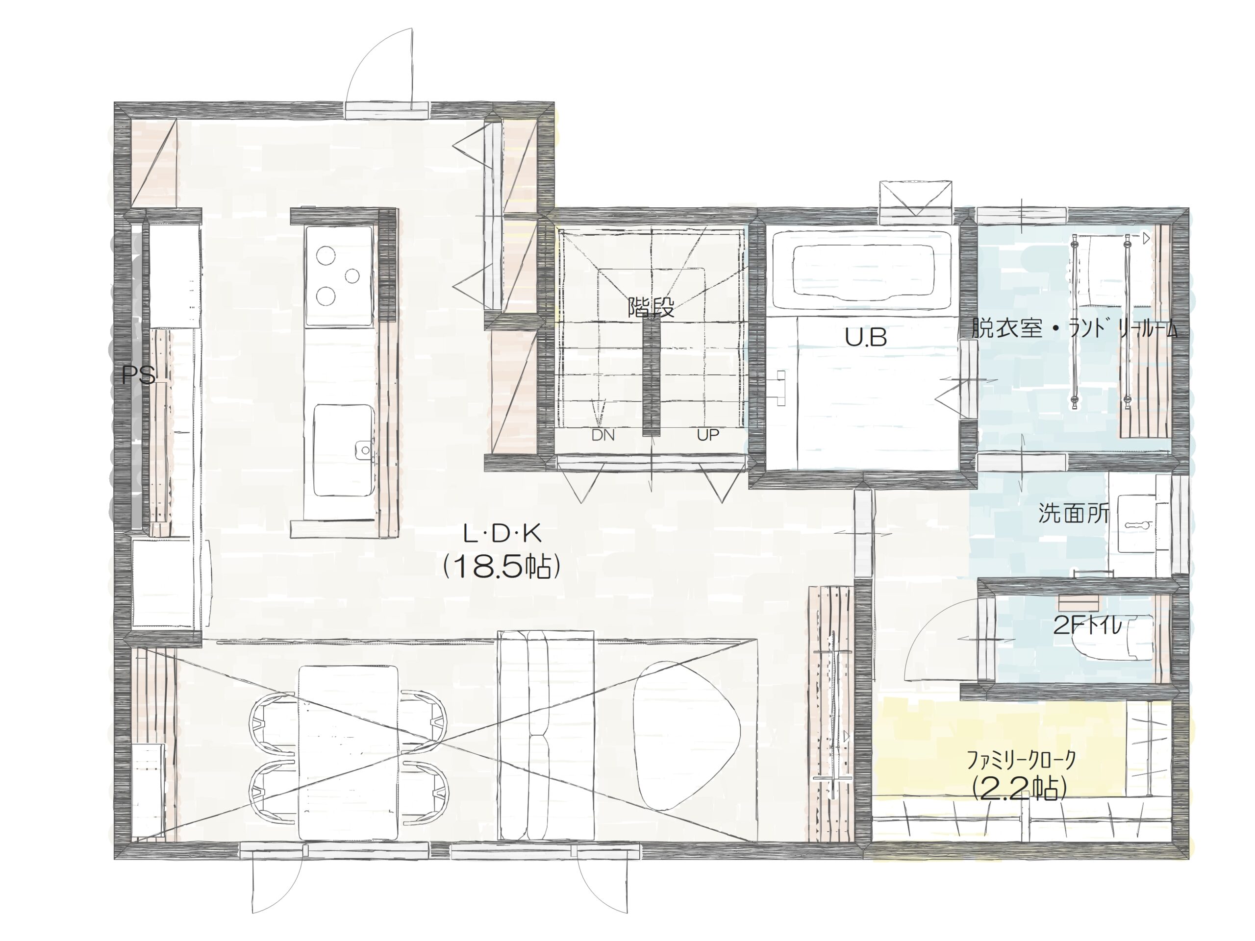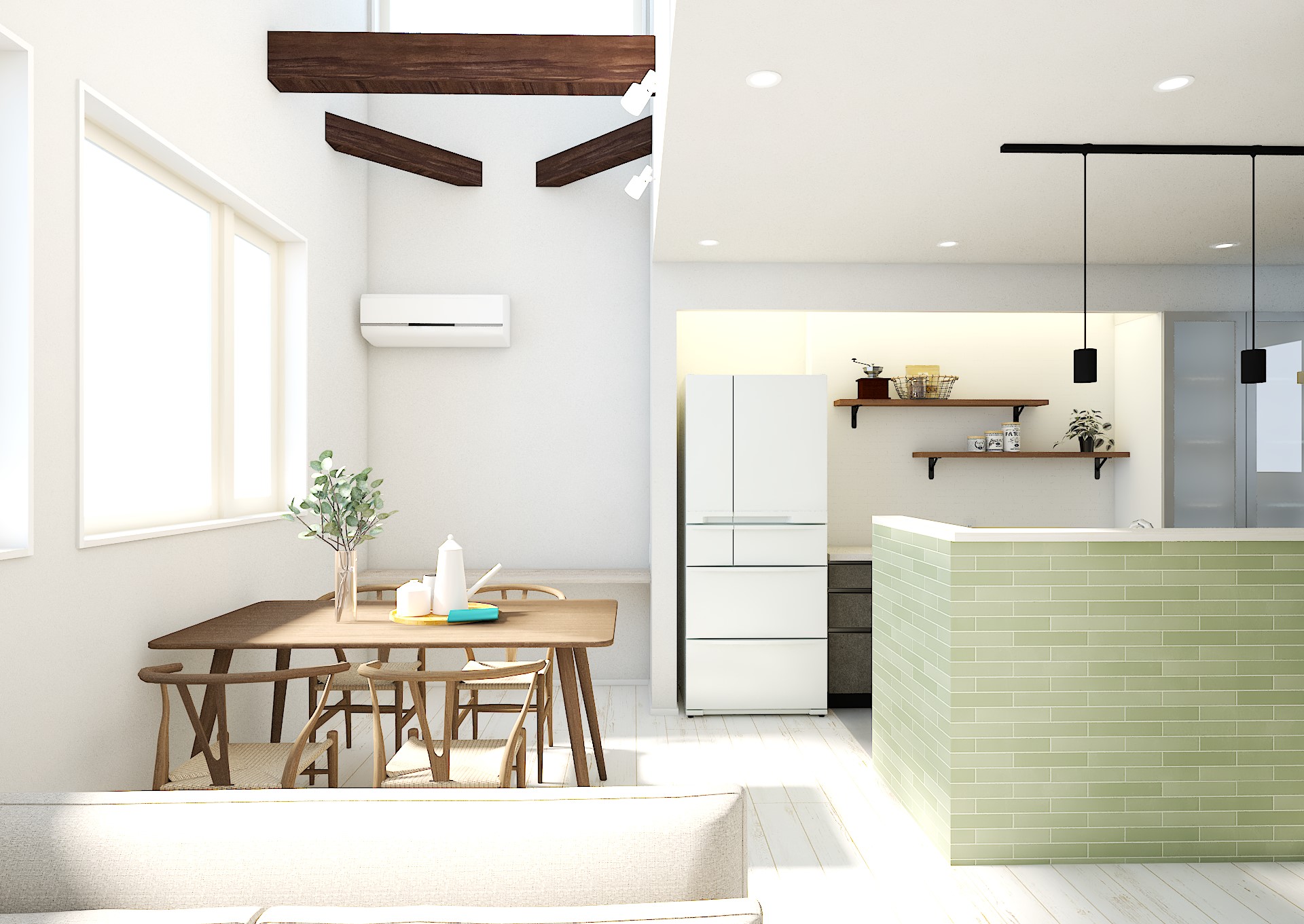 家事動線とタイル張りキッチンや間接照明などデザイン性も兼ね備えたお家です