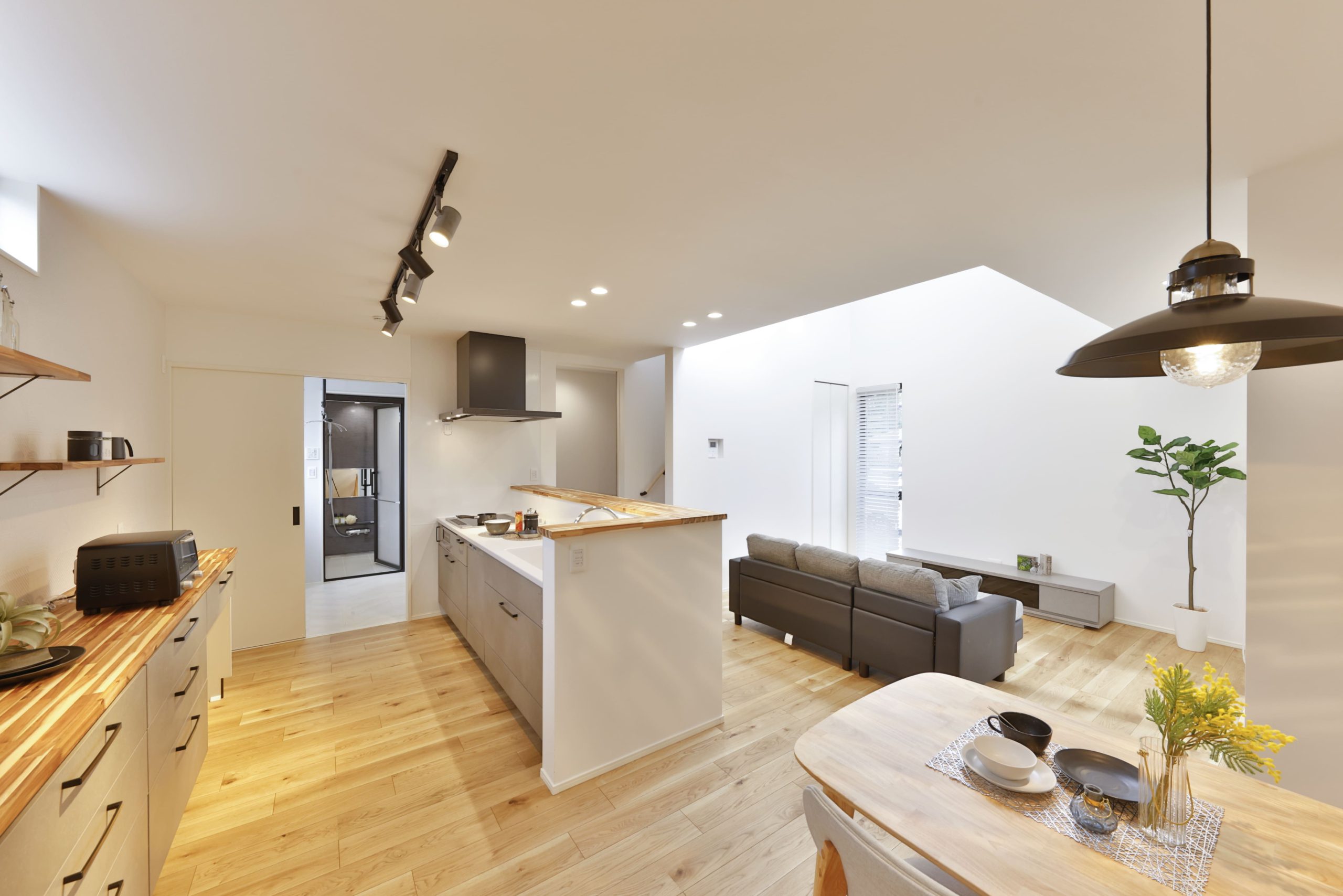 延床面積28坪とコンパクトながら、リビング上部の吹き抜けによりコンパクトさを感じさせない開放的で奥行きのある空間に仕上がっています!玄関⇒洗面コーナー⇒ランドリールーム⇒キッチンへと生活に便利な回遊動線、寝室はWIC付で設備も充実◎欲しい設備が揃った、無駄のない住まいをぜひご覧ください。