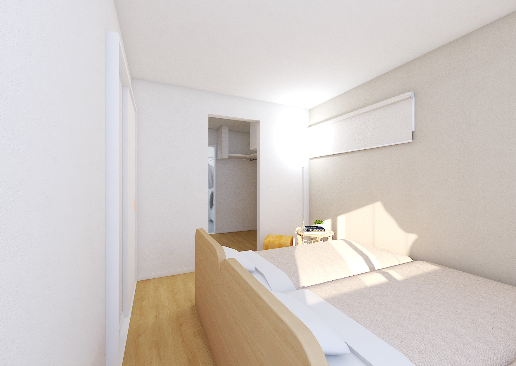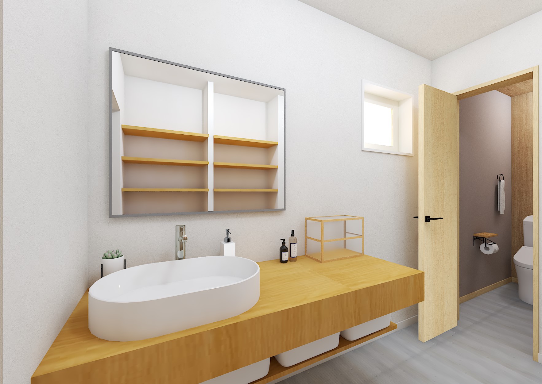 考えられた水回り動線で、洗面台はどこからでも使いやすい位置に配置、ナチュラルテイストであたたかみのある内装に仕上がりました。