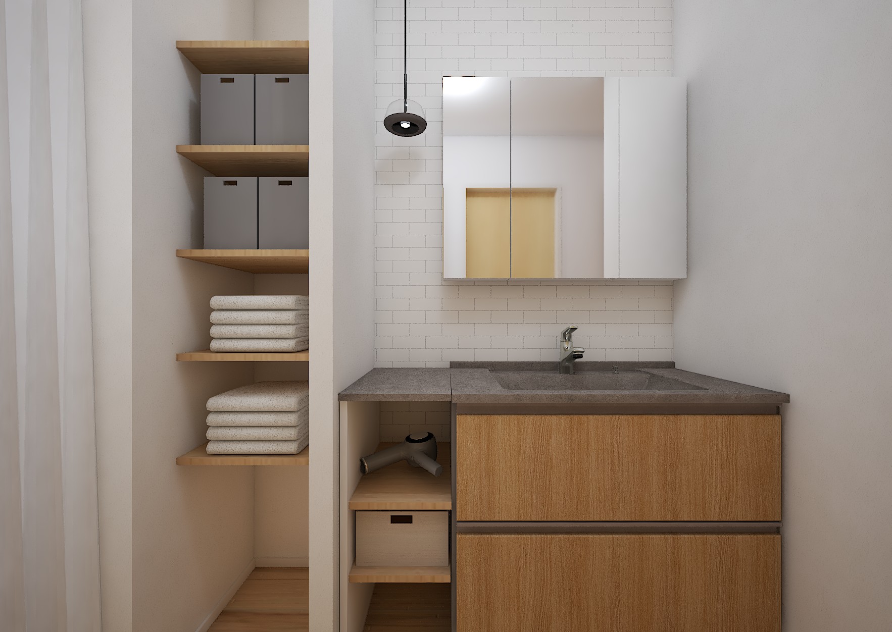 脱衣室と洗面室を分けることで、洗面をいつでも使えるよう独立させ、